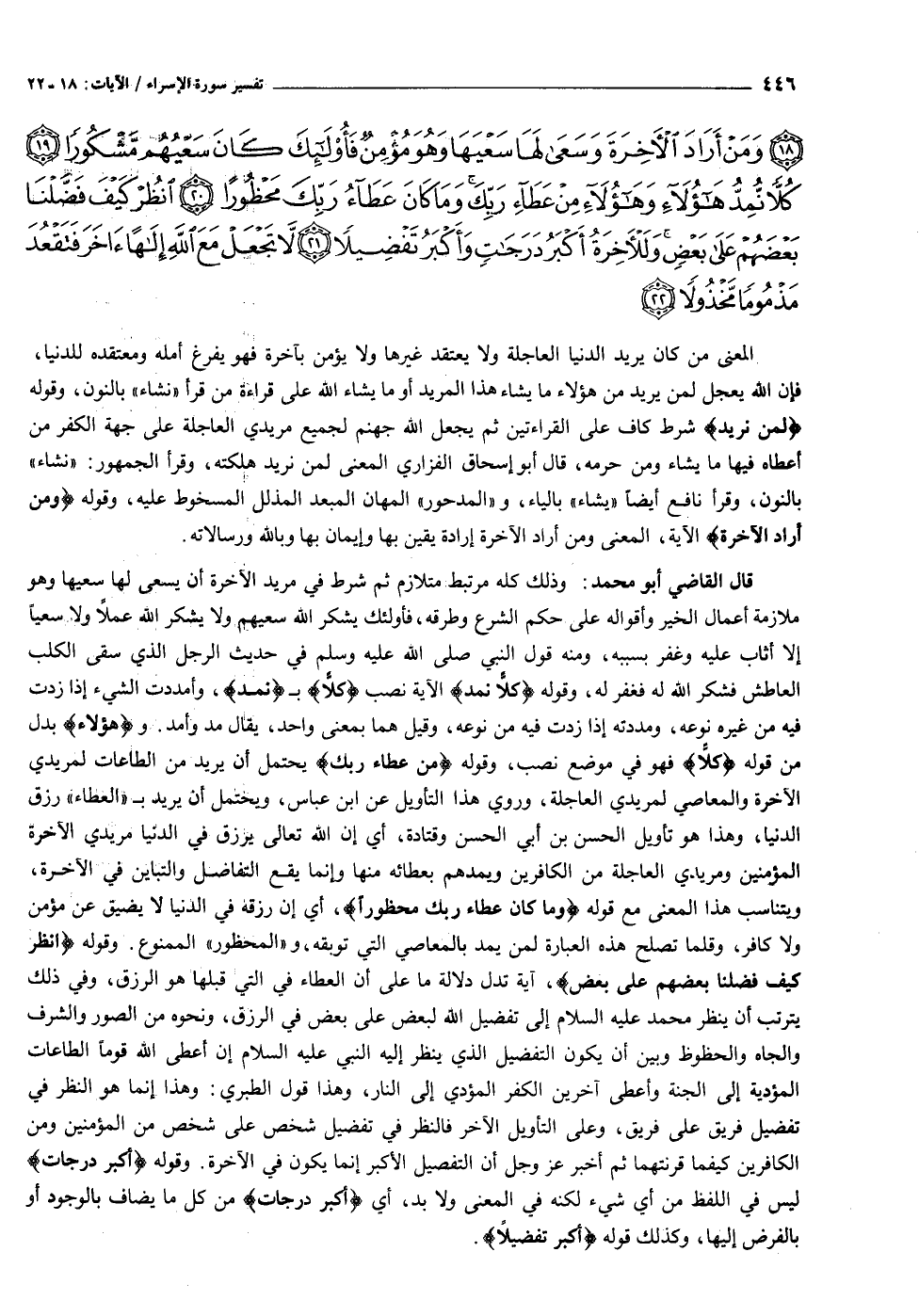 مَنْ كانَ يُرِيدُ الْعاجِلَةَ عَجَّلْنا لَهُ فِيها ما نَشاءُ لِمَنْ نُرِيدُ ثُمَّ جَعَلْنا لَهُ جَهَنَّمَ يَصْلاها مَذْمُوماً مَدْحُوراً (١٨) وَمَنْ أَرادَ الْآخِرَةَ وَسَعى لَها سَعْيَها وَهُوَ مُؤْمِنٌ فَأُولئِكَ كانَ سَعْيُهُمْ مَشْكُوراً (١٩) كُلاًّ نُمِدُّ هؤُلاءِ وَهَؤُلاءِ مِنْ عَطاءِ رَبِّكَ وَما كانَ عَطاءُ رَبِّكَ مَحْظُوراً (٢٠) انْظُرْ كَيْفَ فَضَّلْنا بَعْضَهُمْ عَلى بَعْضٍ وَلَلْآخِرَةُ أَكْبَرُ دَرَجاتٍ وَأَكْبَرُ تَفْضِيلاً (٢١) لا تَجْعَلْ مَعَ اللَّهِ إِلهاً آخَرَ فَتَقْعُدَ مَذْمُوماً مَخْذُولاً (٢٢)
