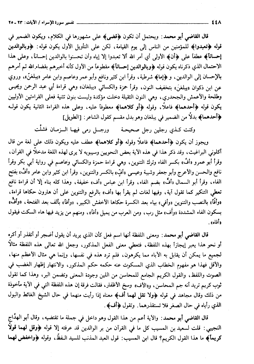 قال القاضي أبو محمد: ويحتمل أن تكون قَضى على مشهورها في الكلام، ويكون الضمير في قوله تَعْبُدُوا للمؤمنين من الناس إلى يوم القيامة، لكن على التأويل الأول يكون قوله: وَبِالْوالِدَيْنِ إِحْساناً عطفا على «أن» الأولى أي أمر الله ألا تعبدوا إلا إياه وأن تحسنوا بالوالدين إحسانا، وعلى هذا الاحتمال الذي ذكرناه يكون قوله وَبِالْوالِدَيْنِ إِحْساناً مقطوعا من الأول كأنه أخبرهم بقضاء الله ثم أمرهم بالإحسان إلى الوالدين، وإِمَّا شرطية، وقرأ ابن كثير ونافع وأبو عمر وعاصم وابن عامر «يبلغنّ» ، وروي عن ابن ذكوان «يبلغن» بتخفيف النون، وقرأ حمزة والكسائي «يبلغان» وهي قراءة أبي عبد الرحمن ويحيى وطلحة والأعمش والجحدري، وهي النون الثقيلة دخلت مؤكدة وليست بنون تثنية فعلى القراءتين الأوليين يكون قوله أَحَدُهُما فاعلا، وقوله أَوْ كِلاهُما معطوفا عليه، وعلى هذه القراءة الثانية يكون قوله أَحَدُهُما بدلا من الضمير في يبلغان وهو بدل مقسم كقول الشاعر: [الطويل]