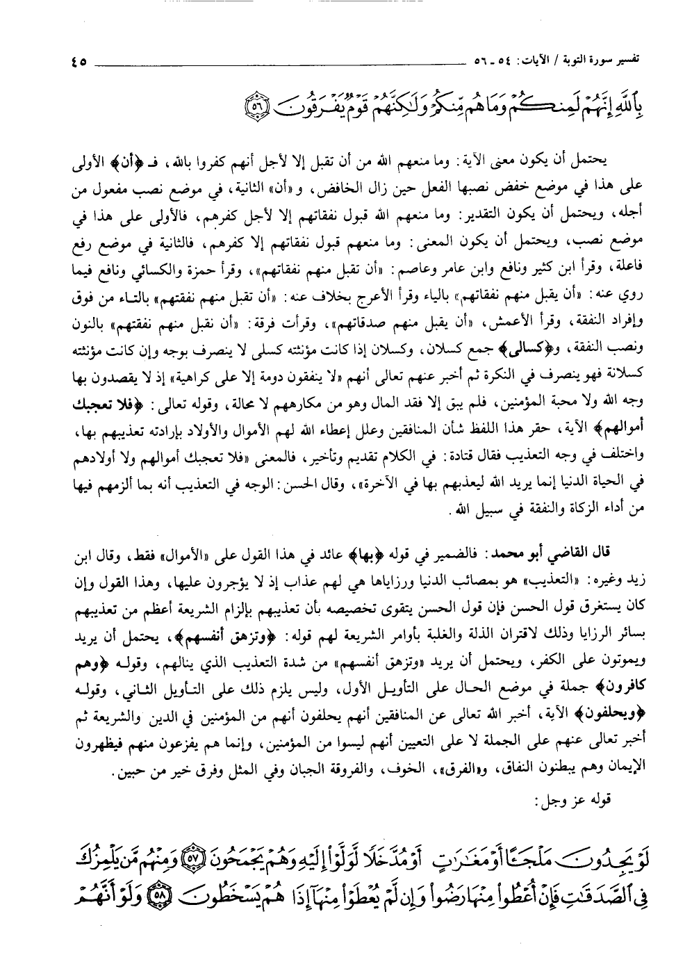 يحتمل أن يكون معنى الآية: وما منعهم الله من أن تقبل إلا لأجل أنهم كفروا بالله، ف أَنْ الأولى على هذا في موضع خفض نصبها الفعل حين زال الخافض، و «أن» الثانية، في موضع نصب مفعول من أجله، ويحتمل أن يكون التقدير: وما منعهم الله قبول نفقاتهم إلا لأجل كفرهم، فالأولى على هذا في موضع نصب، ويحتمل أن يكون المعنى: وما منعهم قبول نفقاتهم إلا كفرهم، فالثانية في موضع رفع فاعلة، وقرأ ابن كثير ونافع وابن عامر وعاصم: «أن تقبل منهم نفقاتهم» ، وقرأ حمزة والكسائي ونافع فيما روي عنه: «أن يقبل منهم نفقاتهم» بالياء وقرأ الأعرج بخلاف عنه: «أن تقبل منهم نفقتهم» بالتاء من فوق وإفراد النفقة، وقرأ الأعمش، «أن يقبل منهم صدقاتهم» ، وقرأت فرقة: «أن نقبل منهم نفقتهم» بالنون ونصب النفقة، وكُسالى جمع كسلان، وكسلان إذا كانت مؤنثته كسلى لا ينصرف بوجه وإن كانت مؤنثته كسلانة فهو ينصرف في النكرة ثم أخبر عنهم تعالى أنهم «لا ينفقون دومة إلا على كراهية» إذ لا يقصدون بها وجه الله ولا محبة المؤمنين، فلم يبق إلا فقد المال وهو من مكارههم لا محالة، وقوله تعالى: فَلا تُعْجِبْكَ أَمْوالُهُمْ الآية، حقر هذا اللفظ شأن المنافقين وعلل إعطاء الله لهم الأموال والأولاد بإرادته تعذيبهم بها، واختلف في وجه التعذيب فقال قتادة: في الكلام تقديم وتأخير، فالمعنى «فلا تعجبك أموالهم ولا أولادهم في الحياة الدنيا إنما يريد الله ليعذبهم بها في الآخرة» ، وقال الحسن: الوجه في التعذيب أنه بما ألزمهم فيها من أداء الزكاة والنفقة في سبيل الله.