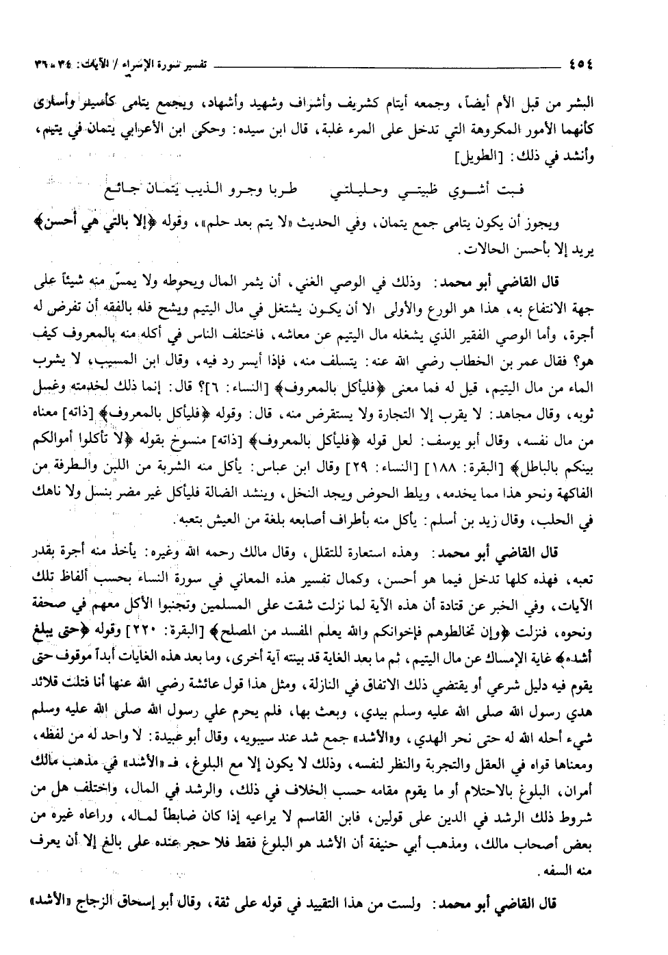 قال القاضي أبو محمد: وهذه استعارة للتقلل، وقال مالك رحمه الله وغيره: يأخذ منه أجرة بقدر تعبه، فهذه كلها تدخل فيما هو أحسن، وكمال تفسير هذه المعاني في سورة النساء بحسب ألفاظ تلك الآيات، وفي الخبر عن قتادة أن هذه الآية لما نزلت شقت على المسلمين وتجنبوا الأكل معهم في صحفة ونحوه، فنزلت وَإِنْ تُخالِطُوهُمْ فَإِخْوانُكُمْ وَاللَّهُ يَعْلَمُ الْمُفْسِدَ مِنَ الْمُصْلِحِ [البقرة: ٢٢٠] وقوله حَتَّى يَبْلُغَ أَشُدَّهُ غاية الإمساك عن مال اليتيم، ثم ما بعد الغاية قد بينته آية أخرى، وما بعد هذه الغايات أبدا موقوف حتى يقوم فيه دليل شرعي أو يقتضي ذلك الاتفاق في النازلة، ومثل هذا قول عائشة رضي الله عنها أنا فتلت قلائد هدي رسول الله صلى الله عليه وسلم بيدي، وبعث بها، فلم يحرم علي رسول الله صلى الله عليه وسلم شيء أحله الله له حتى نحر الهدي، و «الأشد» جمع شد عند سيبويه، وقال أبو عبيدة: لا واحد له من لفظه، ومعناها قواه في العقل والتجربة والنظر لنفسه، وذلك لا يكون إلا مع البلوغ، ف «الأشد» في مذهب مالك أمران، البلوغ بالاحتلام أو ما يقوم مقامه حسب الخلاف في ذلك، والرشد في المال، واختلف هل من شروط ذلك الرشد في الدين على قولين، فابن القاسم لا يراعيه إذا كان ضابطا لماله، وراعاه غيره من بعض أصحاب مالك، ومذهب أبي حنيفة أن الأشد هو البلوغ فقط فلا حجر عنده على بالغ إلا أن يعرف منه السفه.