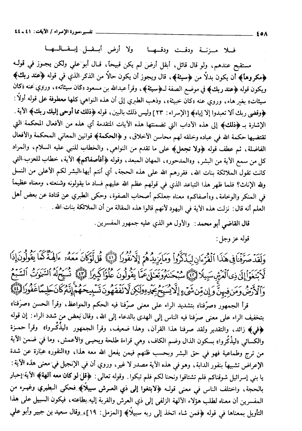 وَلَقَدْ صَرَّفْنا فِي هذَا الْقُرْآنِ لِيَذَّكَّرُوا وَما يَزِيدُهُمْ إِلاَّ نُفُوراً (٤١) قُلْ لَوْ كانَ مَعَهُ آلِهَةٌ كَما يَقُولُونَ إِذاً لابْتَغَوْا إِلى ذِي الْعَرْشِ سَبِيلاً (٤٢) سُبْحانَهُ وَتَعالى عَمَّا يَقُولُونَ عُلُوًّا كَبِيراً (٤٣) تُسَبِّحُ لَهُ السَّماواتُ السَّبْعُ وَالْأَرْضُ وَمَنْ فِيهِنَّ وَإِنْ مِنْ شَيْءٍ إِلاَّ يُسَبِّحُ بِحَمْدِهِ وَلكِنْ لا تَفْقَهُونَ تَسْبِيحَهُمْ إِنَّهُ كانَ حَلِيماً غَفُوراً (٤٤)