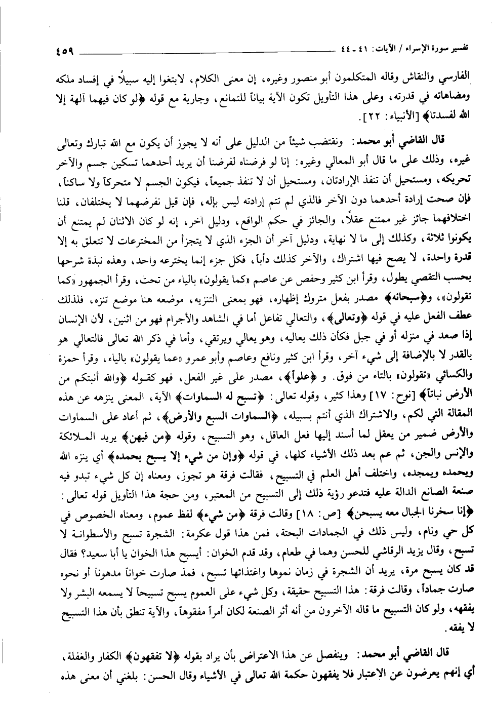 قال القاضي أبو محمد: ونقتضب شيئا من الدليل على أنه لا يجوز أن يكون مع الله تبارك وتعالى غيره، وذلك على ما قال أبو المعالي وغيره: إنا لو فرضناه لفرضنا أن يريد أحدهما تسكين جسم والآخر تحريكه، ومستحيل أن تنفذ الإرادتان، ومستحيل أن لا تنفذ جميعا، فيكون الجسم لا متحركا ولا ساكنا، فإن صحت إرادة أحدهما دون الآخر فالذي لم تتم إرادته ليس بإله، فإن قيل نفرضهما لا يختلفان، قلنا اختلافهما جائز غير ممتنع عقلا، والجائز في حكم الواقع، ودليل آخر، إنه لو كان الاثنان لم يمتنع أن يكونوا ثلاثة، وكذلك إلى ما لا نهاية، ودليل آخر أن الجزء الذي لا يتجزأ من المخترعات لا تتعلق به إلا قدرة واحدة، لا يصح فيها اشتراك، والآخر كذلك دأبا، فكل جزء إنما يخترعه واحد، وهذه نبذة شرحها بحسب التقصي يطول، وقرأ ابن كثير وحفص عن عاصم «كما يقولون» بالياء من تحت، وقرأ الجمهور «كما تقولون» ، وسُبْحانَهُ مصدر بفعل متروك إظهاره، فهو بمعنى التنزيه، موضعه هنا موضع تنزه، فلذلك عطف الفعل عليه في قوله وَتَعالى، والتعالي تفاعل أما في الشاهد والأجرام فهو من اثنين، لأن الإنسان إذا صعد في منزله أو في جبل فكأن ذلك يعاليه، وهو يعالي ويرتقي، وأما في ذكر الله تعالى فالتعالي هو بالقدر لا بالإضافة إلى شيء آخر، وقرأ ابن كثير ونافع وعاصم وأبو عمرو «عما يقولون» بالياء، وقرأ حمزة والكسائي «تقولون» بالتاء من فوق. وعُلُوًّا، مصدر على غير الفعل، فهو كقوله وَاللَّهُ أَنْبَتَكُمْ مِنَ الْأَرْضِ نَباتاً [نوح: ١٧] وهذا كثير، وقوله تعالى: تُسَبِّحُ لَهُ السَّماواتُ الآية، المعنى ينزهه عن هذه المقالة التي لكم، والاشتراك الذي أنتم بسبيله، السَّماواتُ السَّبْعُ وَالْأَرْضُ، ثم أعاد على السماوات والأرض ضمير من يعقل لما أسند إليها فعل العاقل، وهو التسبيح، وقوله مَنْ فِيهِنَّ يريد الملائكة والإنس والجن، ثم عم بعد ذلك الأشياء كلها، في قوله وَإِنْ مِنْ شَيْءٍ إِلَّا يُسَبِّحُ بِحَمْدِهِ أي ينزه الله ويحمده ويمجده، واختلف أهل العلم في التسبيح، فقالت فرقة هو تجوز، ومعناه إن كل شيء تبدو فيه صنعة الصانع الدالة عليه فتدعو رؤية ذلك إلى التسبيح من المعتبر، ومن حجة هذا التأويل قوله تعالى: