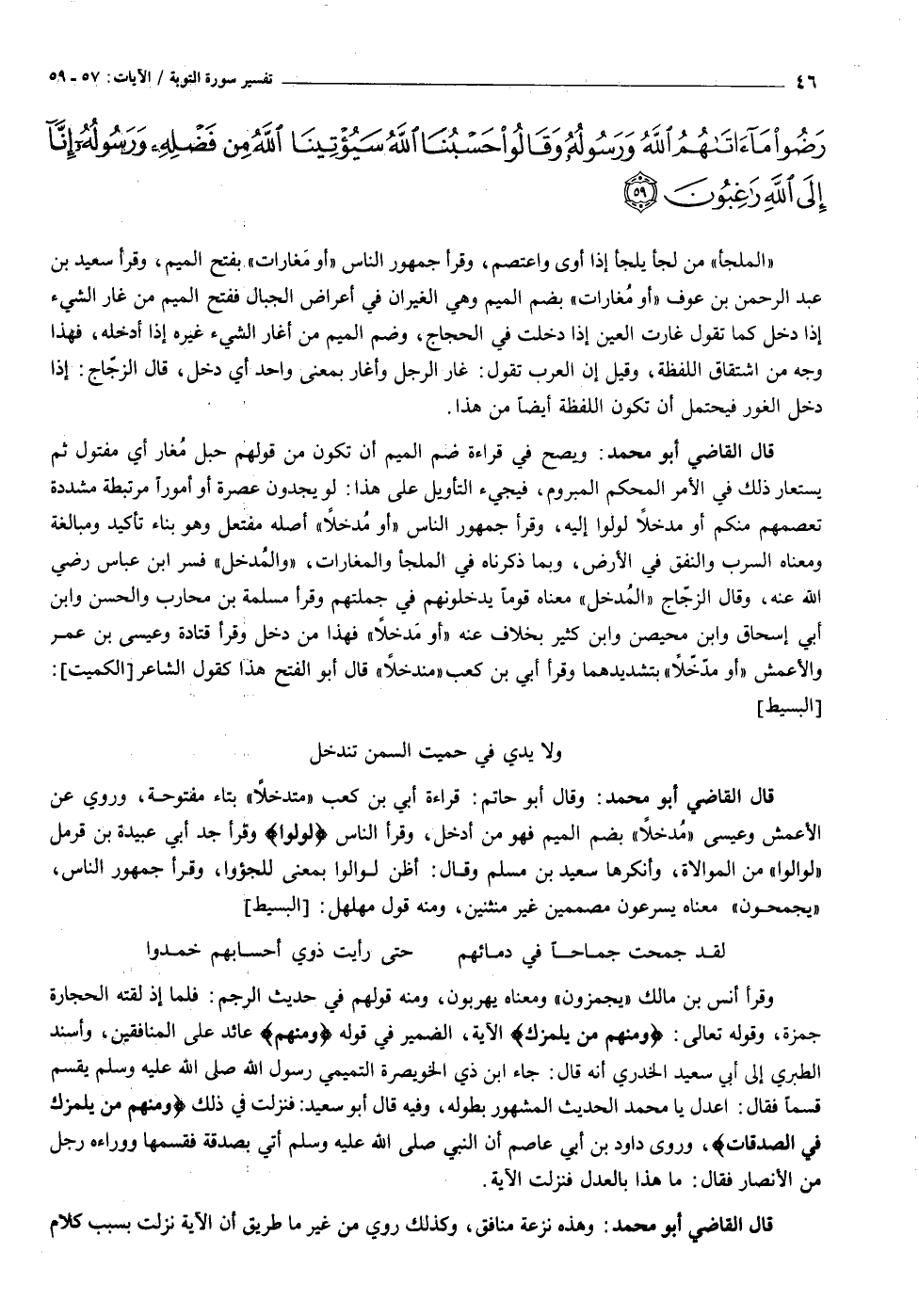[البسيط] ولا يدي في حميت السمن تندخل قال القاضي أبو محمد: وقال أبو حاتم: قراءة أبي بن كعب «متدخلا» بتاء مفتوحة، وروي عن الأعمش وعيسى «مدخلا» بضم الميم فهو من أدخل، وقرأ الناس «لولوا» وقرأ جد أبي عبيدة بن قرمل «لوالوا» من الموالاة، وأنكرها سعيد بن مسلم وقال: أظن لوالوا بمعنى للجؤوا، وقرأ جمهور الناس، «يجمحون» معناه يسرعون مصممين غير منثنين، ومنه قول مهلهل: [البسيط]