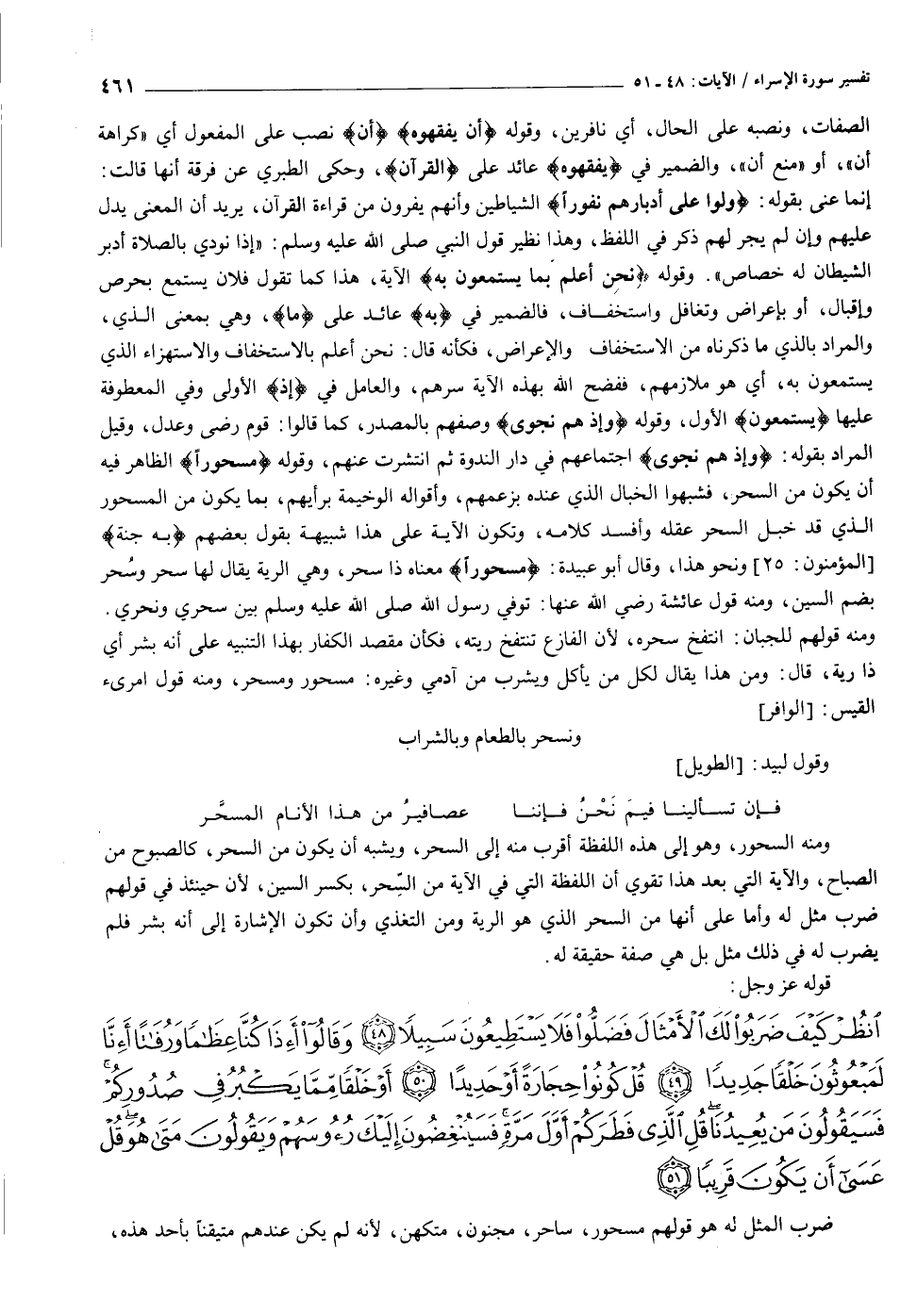 إنما عنى بقوله: وَلَّوْا عَلى أَدْبارِهِمْ نُفُوراً الشياطين وأنهم يفرون من قراءة القرآن، يريد أن المعنى يدل عليهم وإن لم يجر لهم ذكر في اللفظ، وهذا نظير قول النبي صلى الله عليه وسلم: «إذا نودي بالصلاة أدبر الشيطان له خصاص» . وقوله نَحْنُ أَعْلَمُ بِما يَسْتَمِعُونَ بِهِ الآية، هذا كما تقول فلان يستمع بحرص وإقبال، أو بإعراض وتغافل واستخفاف، فالضمير في بِهِ عائد على «ما» ، وهي بمعنى الذي، والمراد بالذي ما ذكرناه من الاستخفاف والإعراض، فكأنه قال: نحن أعلم بالاستخفاف والاستهزاء الذي يستمعون به، أي هو ملازمهم، ففضح الله بهذه الآية سرهم، والعامل في إِذْ الأولى وفي المعطوفة عليها يَسْتَمِعُونَ الأول، وقوله وَإِذْ هُمْ نَجْوى وصفهم بالمصدر، كما قالوا: قوم رضى وعدل، وقيل المراد بقوله: وَإِذْ هُمْ نَجْوى اجتماعهم في دار الندوة ثم انتشرت عنهم، وقوله مَسْحُوراً الظاهر فيه أن يكون من السحر، فشبهوا الخبال الذي عنده بزعمهم، وأقواله الوخيمة برأيهم، بما يكون من المسحور الذي قد خبل السحر عقله وأفسد كلامه، وتكون الآية على هذا شبيهة بقول بعضهم بِهِ جِنَّةٌ [المؤمنون: ٢٥] ونحو هذا، وقال أبو عبيدة: مَسْحُوراً معناه ذا سحر، وهي الرية يقال لها سحر وسحر بضم السين، ومنه قول عائشة رضي الله عنها: توفي رسول الله صلى الله عليه وسلم بين سحري ونحري.
