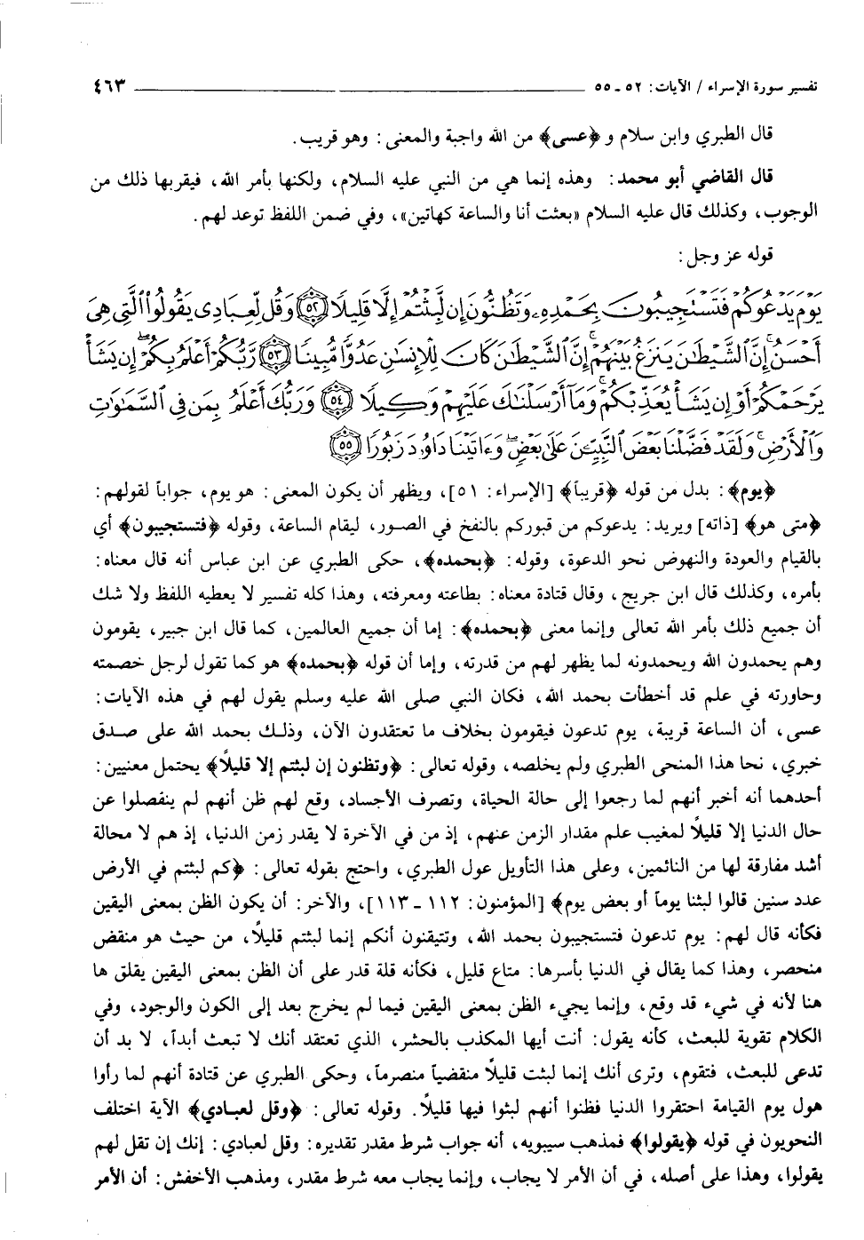 يَوْمَ يَدْعُوكُمْ فَتَسْتَجِيبُونَ بِحَمْدِهِ وَتَظُنُّونَ إِنْ لَبِثْتُمْ إِلاَّ قَلِيلاً (٥٢) وَقُلْ لِعِبادِي يَقُولُوا الَّتِي هِيَ أَحْسَنُ إِنَّ الشَّيْطانَ يَنْزَغُ بَيْنَهُمْ إِنَّ الشَّيْطانَ كانَ لِلْإِنْسانِ عَدُوًّا مُبِيناً (٥٣) رَبُّكُمْ أَعْلَمُ بِكُمْ إِنْ يَشَأْ يَرْحَمْكُمْ أَوْ إِنْ يَشَأْ يُعَذِّبْكُمْ وَما أَرْسَلْناكَ عَلَيْهِمْ وَكِيلاً (٥٤) وَرَبُّكَ أَعْلَمُ بِمَنْ فِي السَّماواتِ وَالْأَرْضِ وَلَقَدْ فَضَّلْنا بَعْضَ النَّبِيِّينَ عَلى بَعْضٍ وَآتَيْنا داوُدَ زَبُوراً (٥٥)