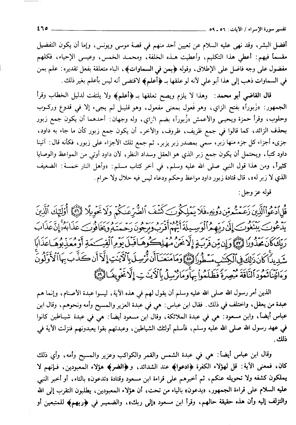 قُلِ ادْعُوا الَّذِينَ زَعَمْتُمْ مِنْ دُونِهِ فَلا يَمْلِكُونَ كَشْفَ الضُّرِّ عَنْكُمْ وَلا تَحْوِيلاً (٥٦) أُولئِكَ الَّذِينَ يَدْعُونَ يَبْتَغُونَ إِلى رَبِّهِمُ الْوَسِيلَةَ أَيُّهُمْ أَقْرَبُ وَيَرْجُونَ رَحْمَتَهُ وَيَخافُونَ عَذابَهُ إِنَّ عَذابَ رَبِّكَ كانَ مَحْذُوراً (٥٧) وَإِنْ مِنْ قَرْيَةٍ إِلاَّ نَحْنُ مُهْلِكُوها قَبْلَ يَوْمِ الْقِيامَةِ أَوْ مُعَذِّبُوها عَذاباً شَدِيداً كانَ ذلِكَ فِي الْكِتابِ مَسْطُوراً (٥٨) وَما مَنَعَنا أَنْ نُرْسِلَ بِالْآياتِ إِلاَّ أَنْ كَذَّبَ بِهَا الْأَوَّلُونَ وَآتَيْنا ثَمُودَ النَّاقَةَ مُبْصِرَةً فَظَلَمُوا بِها وَما نُرْسِلُ بِالْآياتِ إِلاَّ تَخْوِيفاً (٥٩)