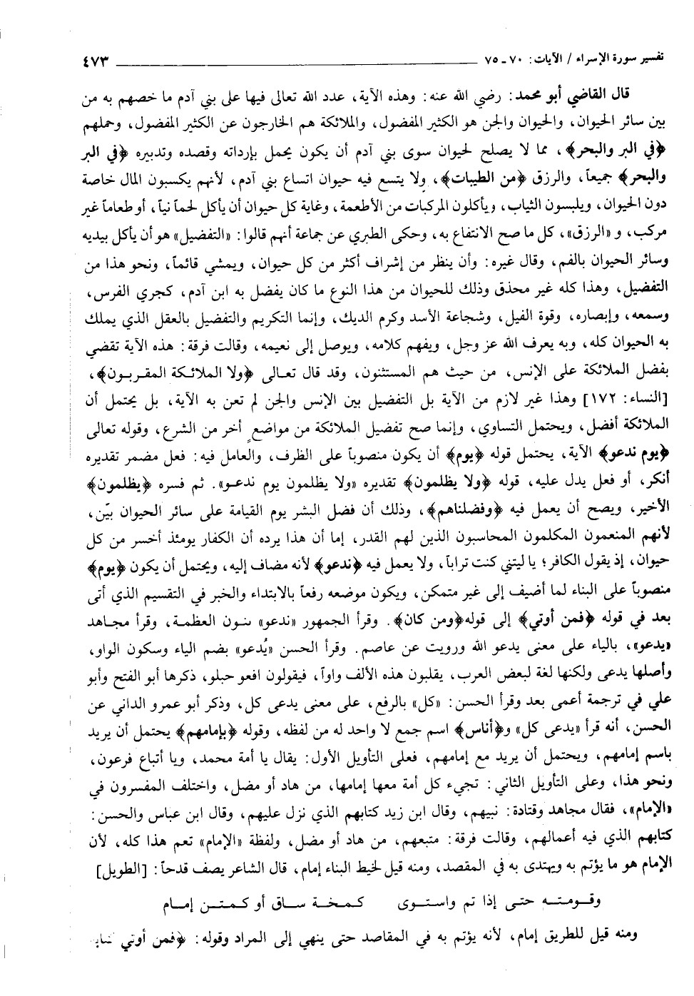 ، [النساء: ١٧٢] وهذا غير لازم من الآية بل التفضيل بين الإنس والجن لم تعن به الآية، بل يحتمل أن الملائكة أفضل، ويحتمل التساوي، وإنما صح تفضيل الملائكة من مواضع أخر من الشرع، وقوله تعالى يَوْمَ نَدْعُوا الآية، يحتمل قوله يَوْمَ أن يكون منصوبا على الظرف، والعامل فيه: فعل مضمر تقديره أنكر، أو فعل يدل عليه، قوله وَلا يُظْلَمُونَ تقديره «ولا يظلمون يوم ندعو» . ثم فسره يُظْلَمُونَ الأخير، ويصح أن يعمل فيه وَفَضَّلْناهُمْ، وذلك أن فضل البشر يوم القيامة على سائر الحيوان بيّن، لأنهم المنعمون المكلمون المحاسبون الذين لهم القدر، إما أن هذا يرده أن الكفار يومئذ أخسر من كل حيوان، إذ يقول الكافر يا ليتني كنت ترابا، ولا يعمل فيه نَدْعُوا لأنه مضاف إليه، ويحتمل أن يكون يَوْمَ منصوبا على البناء لما أضيف إلى غير متمكن، ويكون موضعه رفعا بالابتداء والخبر في التقسيم الذي أتى بعد في قوله فَمَنْ أُوتِيَ إلى قوله وَمَنْ كانَ. وقرأ الجمهور «ندعو» بنون العظمة، وقرأ مجاهد «يدعو» ، بالياء على معنى يدعو الله ورويت عن عاصم. وقرأ الحسن «يدعو» بضم الياء وسكون الواو، وأصلها يدعى ولكنها لغة لبعض العرب، يقلبون هذه الألف واوا، فيقولون افعو حبلو، ذكرها أبو الفتح وأبو علي في ترجمة أعمى بعد وقرأ الحسن: «كل» بالرفع، على معنى يدعى كل، وذكر أبو عمرو الداني عن الحسن، أنه قرأ «يدعى كل» وأُناسٍ اسم جمع لا واحد له من لفظه، وقوله بِإِمامِهِمْ يحتمل أن يريد باسم إمامهم، ويحتمل أن يريد مع إمامهم، فعلى التأويل الأول: يقال يا أمة محمد، ويا أتباع فرعون، ونحو هذا، وعلى التأويل الثاني: تجيء كل أمة معها إمامها، من هاد أو مضل، واختلف المفسرون في «الإمام» ، فقال مجاهد وقتادة: نبيهم، وقال ابن زيد كتابهم الذي نزل عليهم، وقال ابن عباس والحسن: