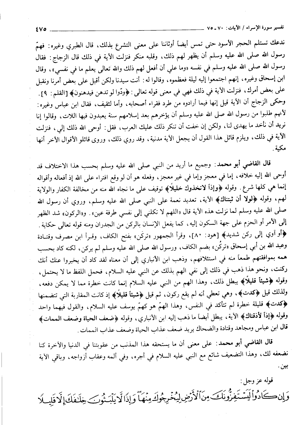 أَوْ آوِي إِلى رُكْنٍ شَدِيدٍ [هود: ٨٠] ، وقرأ الجمهور «تركن» بفتح الكاف، وقرأ ابن مصرف وقتادة وعبد الله بن أبي إسحاق «تركن» بضم الكاف، ورسول الله صلى الله عليه وسلم لم يركن، لكنه كاد بحسب همه بموافقتهم طمعا منه في استئلافهم، وذهب ابن الأنباري إلى أن معناه لقد كاد أن يخبروا عنك أنك ركنت، ونحو هذا ذهب في ذلك إلى نفي الهم بذلك عن النبي عليه السلام، فحمل اللفظ ما لا يحتمل، وقوله شَيْئاً قَلِيلًا يبطل ذلك، وهذا الهم من النبي عليه السلام إنما كانت خطرة مما لا يمكن دفعه، ولذلك قيل كِدْتَ، وهي تعطي أنه لم يقع ركون، ثم قيل شَيْئاً قَلِيلًا إذ كانت المقاربة التي تتضمنها كِدْتَ قليلة خطرة لم تتأكد في النفس، وهذا الهمّ هو كهمّ يوسف عليه السلام، والقول فيهما واحد وقوله إِذاً لَأَذَقْناكَ الآية، يبطل أيضا ما ذهب إليه ابن الأنباري، وقوله ضِعْفَ الْحَياةِ وَضِعْفَ الْمَماتِ قال ابن عباس ومجاهد وقتادة والضحاك يريد ضعف عذاب الحياة وضعف عذاب الممات.