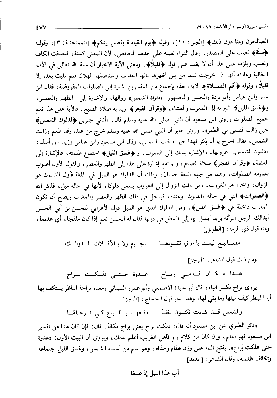 «دلوك الشمس» غروبها، والإشارة بذلك إلى المغرب، وغَسَقِ اللَّيْلِ اجتماع ظلمته، فالإشارة إلى العتمة، وَقُرْآنَ الْفَجْرِ صلاة الصبح، ولم تقع إشارة على هذا إلى الظهر والعصر، والقول الأول أصوب لعمومه الصلوات، وهما من جهة اللغة حسنان، وذلك أن الدلوك هو الميل في اللغة فأول الدلوك هو الزوال، وآخره هو الغروب، ومن وقت الزوال إلى الغروب يسمى دلوكا، لأنها في حالة ميل، فذكر الله الصلوات التي في حالة «الدلوك» وعنده، فيدخل في ذلك الظهر والعصر والمغرب ويصح أن تكون المغرب داخلة في غَسَقِ اللَّيْلِ، ومن الدلوك الذي هو الميل قول الأعرابي للحسن بن أبي الحسن أيدالك الرجل امرأته يريد أيميل بها إلى المطل في دينها فقال له الحسن نعم إذا كان ملفجا، أي عديما، ومنه قول ذي الرمة: [الطويل]