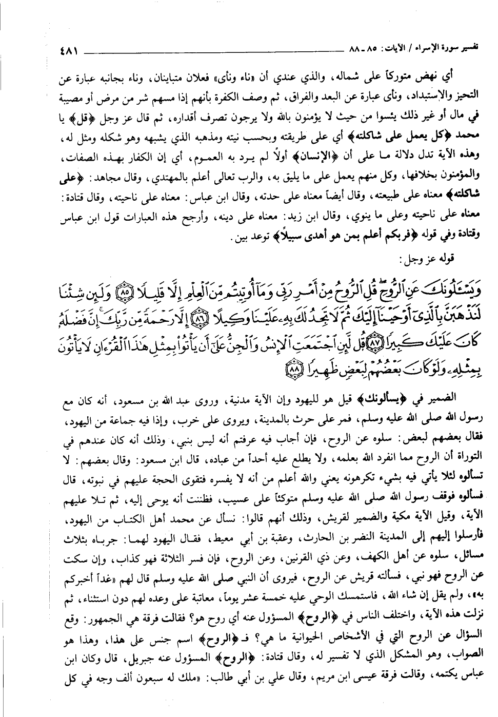 وَيَسْئَلُونَكَ عَنِ الرُّوحِ قُلِ الرُّوحُ مِنْ أَمْرِ رَبِّي وَما أُوتِيتُمْ مِنَ الْعِلْمِ إِلاَّ قَلِيلاً (٨٥) وَلَئِنْ شِئْنا لَنَذْهَبَنَّ بِالَّذِي أَوْحَيْنا إِلَيْكَ ثُمَّ لا تَجِدُ لَكَ بِهِ عَلَيْنا وَكِيلاً (٨٦) إِلاَّ رَحْمَةً مِنْ رَبِّكَ إِنَّ فَضْلَهُ كانَ عَلَيْكَ كَبِيراً (٨٧) قُلْ لَئِنِ اجْتَمَعَتِ الْإِنْسُ وَالْجِنُّ عَلى أَنْ يَأْتُوا بِمِثْلِ هذَا الْقُرْآنِ لا يَأْتُونَ بِمِثْلِهِ وَلَوْ كانَ بَعْضُهُمْ لِبَعْضٍ ظَهِيراً (٨٨)