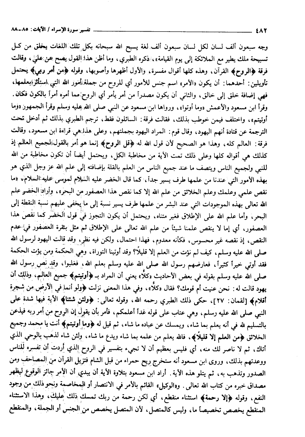 وقرأ ابن مسعود والأعمش «وما أوتوا» ، ورواها ابن مسعود عن النبي صلى الله عليه وسلم وقرأ الجمهور «وما أوتيتم» ، واختلف فيمن خوطب بذلك، فقالت فرقة: السائلون فقط، ترجم الطبري بذلك ثم أدخل تحت الترجمة عن قتادة أنهم اليهود، وقال قوم: المراد اليهود بجملتهم، وعلى هذا هي قراءة ابن مسعود، وقالت فرقة: العالم كله، وهذا هو الصحيح لأن قول الله له قُلِ الرُّوحُ إنما هو أمر بالقول لجميع العالم إذ كذلك هي أقواله كلها وعلى ذلك تمت الآية من مخاطبة الكل، ويحتمل أيضا أن تكون مخاطبة من الله للنبي ولجميع الناس ويتصف ما عند جميع الناس من العلم بالقلة بإضافته إلى علم الله عز وجل الذي هو بهذه الأمور التي عندنا من علمها طرف يسير جدا، كما قال الخضر عليه السلام لموسى عليه السلام، «ما نقص علمي وعلمك وعلم الخلائق من علم الله إلا كما نقص هذا العصفور من البحر» ، وأراد الخضر علم الله تعالى بهذه الموجودات التي عند البشر من علمها طرف يسير نسبة إلى ما يخفى عليهم نسبة النقطة إلى البحر، وأما علم الله على الإطلاق فغير متناه، ويحتمل أن يكون التجوز في قول الخضر كما نقص هذا العصفور، أي إما لا ينقص علمنا شيئا من علم الله تعالى على الإطلاق ثم مثل بنقرة العصفور في عدم النقص، إذ نقصه غير محسوس، فكأنه معدوم، فهذا احتمال، ولكن فيه نظر، وقد قالت اليهود لرسول الله صلى الله عليه وسلم، كيف لم نؤت من العلم إلا قليلا؟ وقد أوتينا التوراة، وهي الحكمة ومن يؤت الحكمة فقد أوتي خيرا كثيرا، فعارضهم رسول الله صلى الله عليه وسلم بعلم الله، فغلبوا، وقد نص رسول الله صلى الله عليه وسلم، كيف لم نؤت من العلم إلا قليلا؟ وقد أوتينا التوراة، وهي الحكمة ومن يؤت الحكمة فقد أوتي خيرا كثيرا، فعارضهم رسول الله صلى الله عليه وسلم بعلم الله، فغلبوا، وقد نص رسول الله صلى الله عليه وسلم بقوله في بعض الأحاديث «كلّا» يعني أن المراد ب أُوتِيتُمْ جميع العالم، وذلك أن يهود قالت له: نحن عنيت أم قومك؟ فقال «كلّا» ، وفي هذا المعنى نزلت وَلَوْ أَنَّما فِي الْأَرْضِ مِنْ شَجَرَةٍ أَقْلامٌ [لقمان: ٢٧] ، حكى ذلك الطبري رحمه الله، وقوله تعالى: وَلَئِنْ شِئْنا الآية فيها شدة على النبي صلى الله عليه وسلم، وهي عتاب على قوله غدا أعلمكم، فأمر بأن يقول إن الروح من أمر ربه فيذعن بالتسليم لله في أنه يعلم بما شاء، ويمسك عن عباده ما شاء، ثم قيل له وَما أُوتِيتُمْ أنت يا محمد وجميع الخلائق مِنَ الْعِلْمِ إِلَّا قَلِيلًا، فالله يعلم من علمه بما شاء ويدع ما شاء، ولئن شاء لذهب بالوحي الذي أتاك، ثم لا ناصر لك منه، أي فليس بعظيم أن لا تجيء بتفسير في الروح الذي أردت أن تفسره للناس ووعدتهم بذلك، وروى ابن مسعود أنه ستخرج ريح حمراء من قبل الشام فتزيل القرآن من المصاحف ومن الصدور وتذهب به، ثم يتلو هذه الآية. أراد ابن مسعود بتلاوة الآية أن يبدي أن الأمر جائز الوقوع ليظهر مصداق خبره من كتاب الله تعالى. و «الوكيل» القائم بالأمر في الانتصار أو المخاصمة ونحو ذلك من وجود النفع، وقوله إِلَّا رَحْمَةً استثناء منقطع، أي لكن رحمة من ربك تمسك ذلك عليك، وهذا الاستثناء المنقطع يخصص تخصيصا ما، وليس كالمتصل، لأن المتصل يخصص من الجنس أو الجملة، والمنقطع