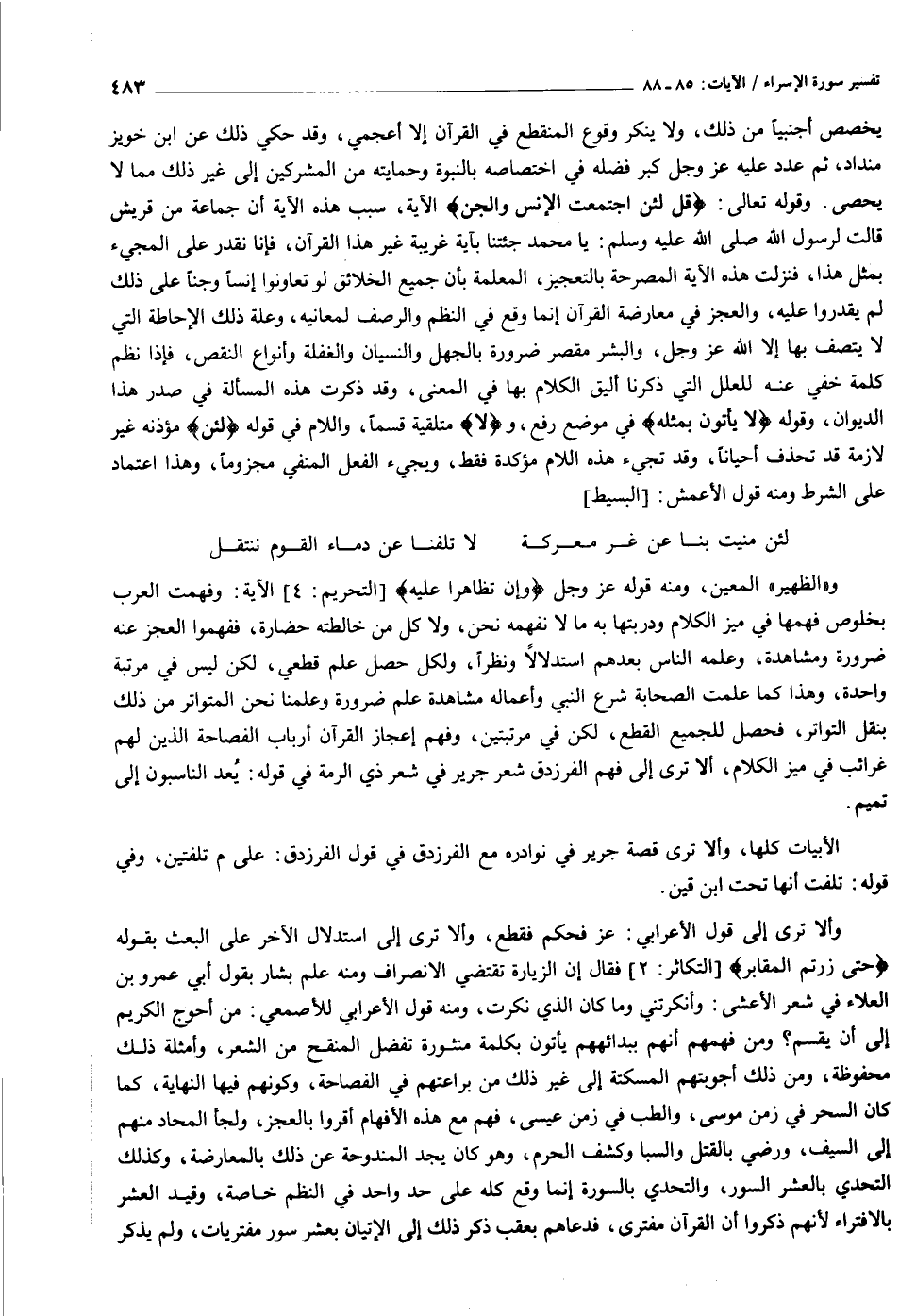 وألا ترى إلى قول الأعرابي: عز فحكم فقطع، وألا ترى إلى استدلال الآخر على البعث بقوله حَتَّى زُرْتُمُ الْمَقابِرَ [التكاثر: ٢] فقال إن الزيارة تقتضي الانصراف ومنه علم بشار بقول أبي عمرو بن العلاء في شعر الأعشى: وأنكرتني وما كان الذي نكرت، ومنه قول الأعرابي للأصمعي: من أحوج الكريم إلى أن يقسم؟ ومن فهمهم أنهم ببدائههم يأتون بكلمة منثورة تفضل المنقح من الشعر، وأمثلة ذلك محفوظة، ومن ذلك أجوبتهم المسكتة إلى غير ذلك من براعتهم في الفصاحة، وكونهم فيها النهاية، كما كان السحر في زمن موسى، والطب في زمن عيسى، فهم مع هذه الأفهام أقروا بالعجز، ولجأ المحاد منهم إلى السيف، ورضي بالقتل والسبا وكشف الحرم، وهو كان يجد المندوحة عن ذلك بالمعارضة، وكذلك التحدي بالعشر السور، والتحدي بالسورة إنما وقع كله على حد واحد في النظم خاصة، وقيد العشر بالافتراء لأنهم ذكروا أن القرآن مفترى، فدعاهم بعقب ذكر ذلك إلى الإتيان بعشر سور مفتريات، ولم يذكر