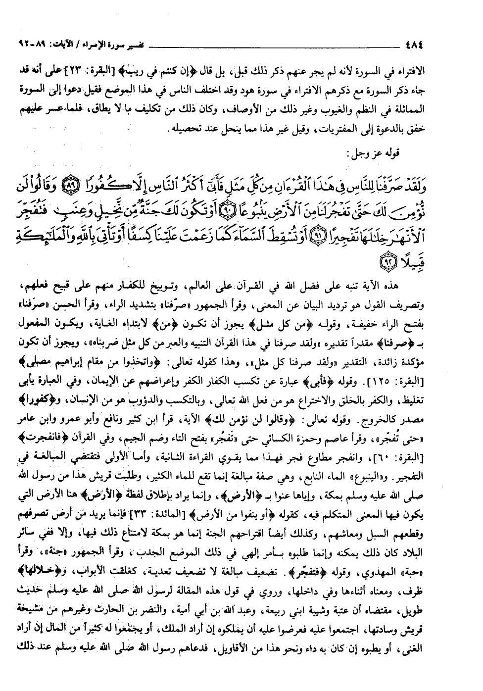 وَلَقَدْ صَرَّفْنا لِلنَّاسِ فِي هذَا الْقُرْآنِ مِنْ كُلِّ مَثَلٍ فَأَبى أَكْثَرُ النَّاسِ إِلاَّ كُفُوراً (٨٩) وَقالُوا لَنْ نُؤْمِنَ لَكَ حَتَّى تَفْجُرَ لَنا مِنَ الْأَرْضِ يَنْبُوعاً (٩٠) أَوْ تَكُونَ لَكَ جَنَّةٌ مِنْ نَخِيلٍ وَعِنَبٍ فَتُفَجِّرَ الْأَنْهارَ خِلالَها تَفْجِيراً (٩١) أَوْ تُسْقِطَ السَّماءَ كَما زَعَمْتَ عَلَيْنا كِسَفاً أَوْ تَأْتِيَ بِاللَّهِ وَالْمَلائِكَةِ قَبِيلاً (٩٢)