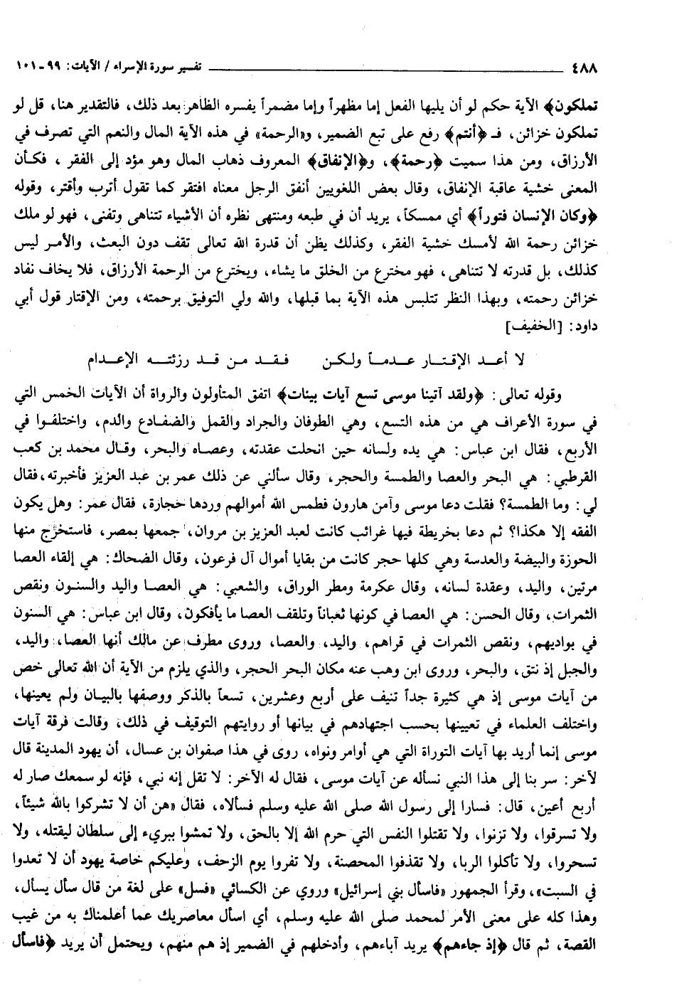 وقوله تعالى: وَلَقَدْ آتَيْنا مُوسى تِسْعَ آياتٍ بَيِّناتٍ اتفق المتأولون والرواة أن الآيات الخمس التي في سورة الأعراف هي من هذه التسع، وهي الطوفان والجراد والقمل والضفادع والدم، واختلفوا في الأربع، فقال ابن عباس: هي يده ولسانه حين انحلت عقدته، وعصاه والبحر، وقال محمد بن كعب القرطبي: هي البحر والعصا والطمسة والحجر، وقال سألني عن ذلك عمر بن عبد العزيز فأخبرته، فقال لي: وما الطمسة؟ فقلت دعا موسى وآمن هارون فطمس الله أموالهم وردها حجارة، فقال عمر: وهل يكون الفقه إلا هكذا؟ ثم دعا بخريطة فيها غرائب كانت لعبد العزيز بن مروان، جمعها بمصر، فاستخرج منها الحوزة والبيضة والعدسة وهي كلها حجر كانت من بقايا أموال آل فرعون، وقال الضحاك: هي إلقاء العصا مرتين، واليد، وعقدة لسانه، وقال عكرمة ومطر الوراق، والشعبي: هي العصا واليد والسنون ونقص الثمرات، وقال الحسن: هي العصا في كونها ثعبانا وتلقف العصا ما يأفكون، وقال ابن عباس: هي السنون في بواديهم، ونقص الثمرات في قراهم، واليد، والعصا، وروى مطرف عن مالك أنها العصا، واليد، والجبل إذ نتق، والبحر، وروى ابن وهب عنه مكان البحر الحجر، والذي يلزم من الآية أن الله تعالى خص من آيات موسى إذ هي كثيرة جدا تنيف على أربع وعشرين، تسعا بالذكر ووصفها بالبيان ولم يعينها، واختلف العلماء في تعيينها بحسب اجتهادهم في بيانها أو روايتهم التوقيف في ذلك، وقالت فرقة آيات موسى إنما أريد بها آيات التوراة التي هي أوامر ونواه، روى في هذا صفوان بن عسال، أن يهود المدينة قال لآخر: سر بنا إلى هذا النبي نسأله عن آيات موسى، فقال له الآخر: لا تقل إنه نبي، فإنه لو سمعك صار له أربع أعين، قال: فسارا إلى رسول الله صلى الله عليه وسلم فسألاه، فقال «هن أن لا تشركوا بالله شيئا، ولا تسرقوا، ولا تزنوا، ولا تقتلوا النفس التي حرم الله إلا بالحق، ولا تمشوا ببريء إلى سلطان ليقتله، ولا تسحروا، ولا تأكلوا الربا، ولا تقذفوا المحصنة، ولا تفروا يوم الزحف، وعليكم خاصة يهود أن لا تعدوا في السبت» ، وقرأ الجمهور «فاسأل بني إسرائيل» وروي عن الكسائي «فسل» على لغة من قال سأل يسأل، وهذا كله على معنى الأمر لمحمد صلى