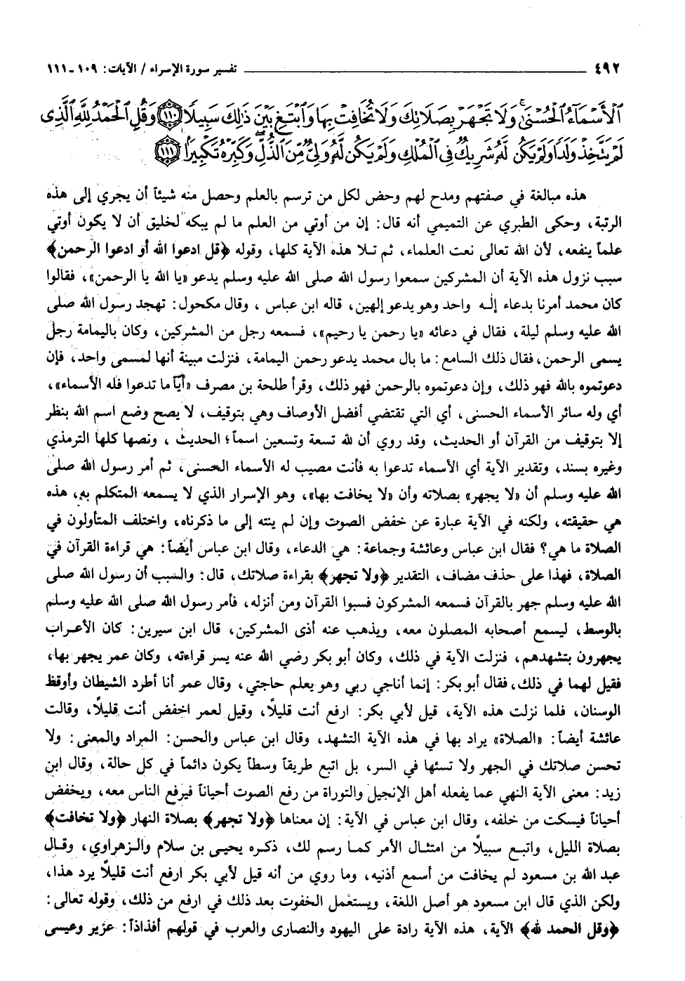 هذه مبالغة في صفتهم ومدح لهم وحض لكل من ترسم بالعلم وحصل منه شيئا أن يجري إلى هذه الرتبة، وحكى الطبري عن التميمي أنه قال: إن من أوتي من العلم ما لم يبكه لخليق أن لا يكون أوتي علما ينفعه، لأن الله تعالى نعت العلماء، ثم تلا هذه الآية كلها، وقوله قُلِ ادْعُوا اللَّهَ أَوِ ادْعُوا الرَّحْمنَ سبب نزول هذه الآية أن المشركين سمعوا رسول الله صلى الله عليه وسلم يدعو «يا الله يا الرحمن» ، فقالوا كان محمد أمرنا بدعاء إله واحد وهو يدعو إلهين، قاله ابن عباس، وقال مكحول: تهجد رسول الله صلى الله عليه وسلم ليلة، فقال في دعائه «يا رحمن يا رحيم» ، فسمعه رجل من المشركين، وكان باليمامة رجل يسمى الرحمن، فقال ذلك السامع: ما بال محمد يدعو رحمن اليمامة، فنزلت مبينة أنها لمسمى واحد، فإن دعوتموه بالله فهو ذلك، وإن دعوتموه بالرحمن فهو ذلك، وقرأ طلحة بن مصرف «أيّا ما تدعوا فله الأسماء» ، أي وله سائر الأسماء الحسنى، أي التي تقتضي أفضل الأوصاف وهي بتوقيف، لا يصح وضع اسم الله بنظر إلا بتوقيف من القرآن أو الحديث، وقد روي أن لله تسعة وتسعين اسما الحديث، ونصها كلها الترمذي وغيره بسند، وتقدير الآية أي الأسماء تدعوا به فأنت مصيب له الأسماء الحسنى، ثم أمر رسول الله صلى الله عليه وسلم أن «لا يجهر» بصلاته وأن «لا يخافت بها» ، وهو الإسرار الذي لا يسمعه المتكلم به، هذه هي حقيقته، ولكنه في الآية عبارة عن خفض الصوت وإن لم ينته إلى ما ذكرناه، واختلف المتأولون في الصلاة ما هي؟ فقال ابن عباس وعائشة وجماعة: هي الدعاء، وقال ابن عباس أيضا: هي قراءة القرآن في الصلاة، فهذا على حذف مضاف، التقدير وَلا تَجْهَرْ بقراءة صلاتك، قال: والسبب أن رسول الله صلى الله عليه وسلم جهر بالقرآن فسمعه المشركون فسبوا القرآن ومن أنزله، فأمر رسول الله صلى الله عليه وسلم بالوسط، ليسمع أصحابه المصلون معه، ويذهب عنه أذى المشركين، قال ابن سيرين: كان الأعراب يجهرون بتشهدهم، فنزلت الآية في ذلك، وكان أبو بكر رضي الله عنه يسر قراءته، وكان عمر يجهر بها، فقيل لهما في ذلك، فقال أبو بكر: إنما أناجي ربي وهو يعلم حاجتي، وقال عمر أنا أطرد الشيطان وأوقظ الوسنان، فلما نزلت هذه الآية، قيل لأبي بكر: ارفع أنت قليلا، وقيل لعمر اخفض أنت قليلا، وقالت عائشة أيضا: «الصلاة» يراد بها في هذه الآية التشهد، وقال ابن عباس والحسن: المراد والمعنى: ولا تحسن صلاتك في الجهر ولا تسئها في السر، بل اتبع طريقا وسطا يكون دائما في كل حالة، وقال ابن زيد: معنى الآية النهي عما يفعله أهل الإنجيل والتوراة من رفع الصوت أحيانا فيرفع الناس معه، ويخفض أحيانا فيسكت من خلفه، وقال ابن عباس في الآية: إن معناها وَلا تَجْهَرْ بصلاة النهار وَلا تُخافِتْ بصلاة الليل، واتبع سبيلا من امتثال الأمر كما رسم لك، ذكره يحيى بن سلام والزهراوي، وقال عبد الله بن مسعود لم يخافت من أسمع أذنيه، وما روي من أنه قيل لأبي بكر ارفع أنت قليلا يرد هذا، ولكن الذي قال ابن مسعود هو أصل اللغة، ويستعمل الخفوت بعد ذلك في ارفع من ذلك، وقوله تعالى:
