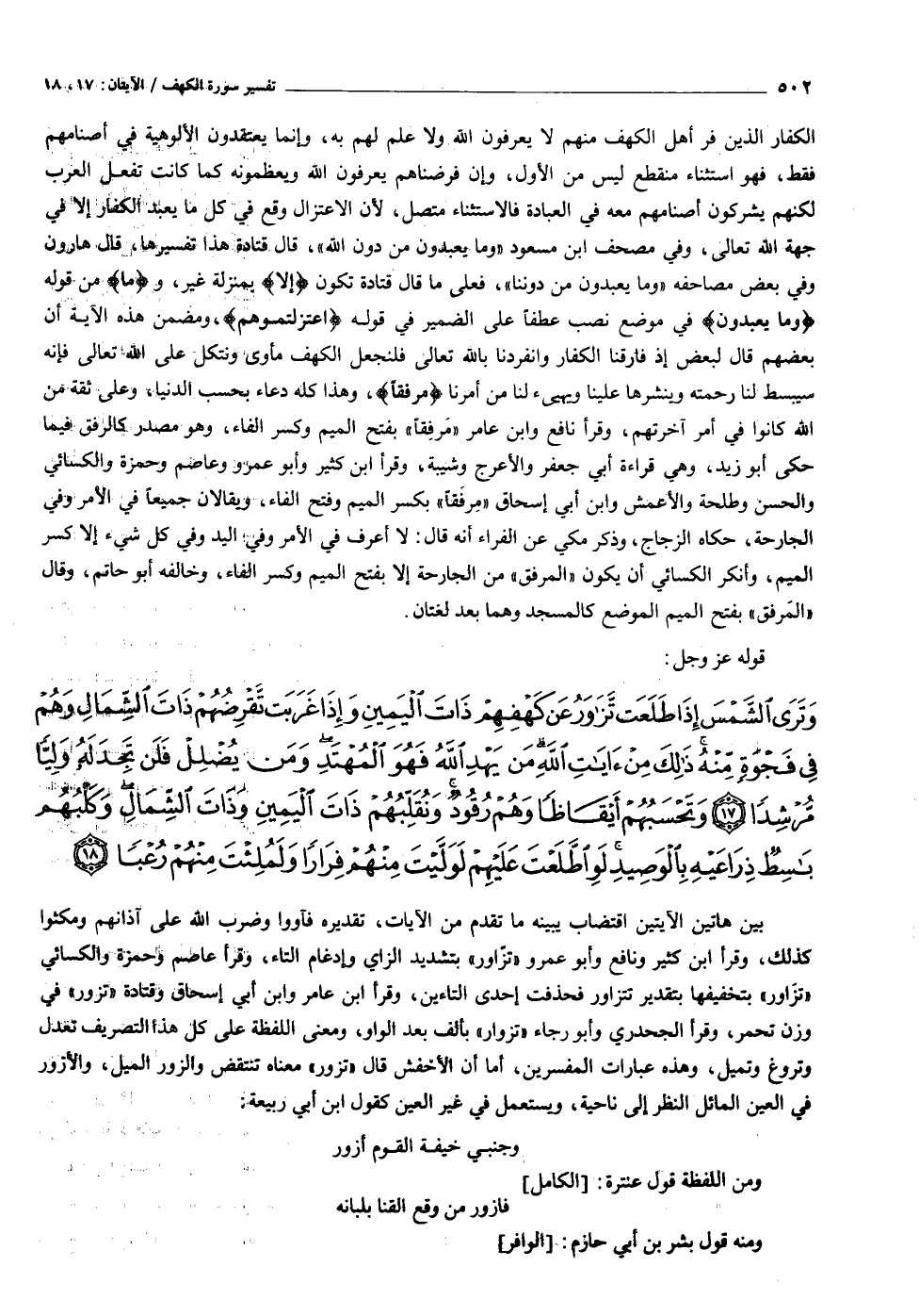 وَتَرَى الشَّمْسَ إِذا طَلَعَتْ تَتَزاوَرُ عَنْ كَهْفِهِمْ ذاتَ الْيَمِينِ وَإِذا غَرَبَتْ تَقْرِضُهُمْ ذاتَ الشِّمالِ وَهُمْ فِي فَجْوَةٍ مِنْهُ ذلِكَ مِنْ آياتِ اللَّهِ مَنْ يَهْدِ اللَّهُ فَهُوَ الْمُهْتَدِ وَمَنْ يُضْلِلْ فَلَنْ تَجِدَ لَهُ وَلِيًّا مُرْشِداً (١٧) وَتَحْسَبُهُمْ أَيْقاظاً وَهُمْ رُقُودٌ وَنُقَلِّبُهُمْ ذاتَ الْيَمِينِ وَذاتَ الشِّمالِ وَكَلْبُهُمْ باسِطٌ ذِراعَيْهِ بِالْوَصِيدِ لَوِ اطَّلَعْتَ عَلَيْهِمْ لَوَلَّيْتَ مِنْهُمْ فِراراً وَلَمُلِئْتَ مِنْهُمْ رُعْباً (١٨)