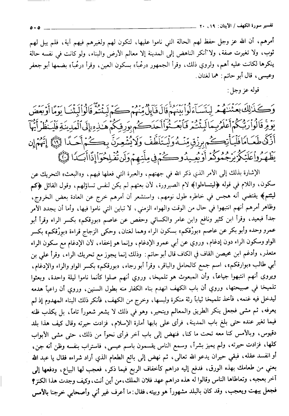الإشارة بذلك إلى الأمر الذي ذكر الله في جهتهم، والعبرة التي فعلها فيهم، و «البعث» التحريك عن سكون، واللام في قوله لِيَتَسائَلُوا لام الصيرورة، لأن بعثهم لم يكن لنفس تساؤلهم، وقول القائل كَمْ لَبِثْتُمْ يقتضي أنه هجس في خاطره طول نومهم، واستشعر أن أمرهم خرج عن العادة بعض الخروج، وظاهر أمرهم أنهم انتبهوا في حال من الوقت والهواء الزمني، لا تباين التي ناموا فيها، وأما أن يجدد الأمر جدا فبعيد، وقرأ ابن كثير ونافع وابن عامر والكسائي وحفص عن عاصم «بورقكم» بكسر الراء وقرأ أبو عمرو وحده وأبو بكر عن عاصم «بورقكم» بسكون الراء وهما لغتان، وحكى الزجاج قراءة «بورقكم» بكسر الواو وسكون الراء دون إدغام، وروي عن أبي عمرو الإدغام، وإنما هو إخفاء، لأن الإدغام مع سكون الراء متعذر، وأدغم ابن محيصن القاف في الكاف قال أبو حاتم: وذلك إنما يجوز مع تحريك الراء، وقرأ علي بن أبي طالب «بوارقكم» ، اسم جمع كالحامل والباقر، وقرأ أبو رجاء، «بورقكم» بكسر الواو والراء والإدغام، ويروى أنهم انتبهوا جياعا، وأن المبعوث هو تلميخا، وروي أنهم صلوا كأنما ناموا ليلة واحدة، وبعثوا تلميخا في صبيحتها، وروي أن باب الكهف انهدم بناء الكفار منه بطول السنين، وروي أن راعيا هدمه ليدخل فيه غنمه، فأخذ تلميخا ثيابا رثة منكرة ولبسها، وخرج من الكهف، فأنكر ذلك البناء المهدوم إذ لم يعرفه، ثم مشى فجعل ينكر الطريق والمعالم ويتحير، وهو في ذلك لا يشعر شعورا تاما، بل يكذب ظنه فيما تغير عنده حتى بلغ باب المدينة، فرأى على بابها أمارة الإسلام، فزادت حيرته وقال كيف هذا بلد دقيوس، وبالأمس كنا معه تحت ما كنا، فنهض إلى باب آخر فرأى نحوا من ذلك، حتى مشى الأبواب كلها، فزادت حيرته، ولم يميز بشرا، وسمع الناس يقسمون باسم عيسى، فاستراب بنفسه وظن أنه جن، أو انفسد عقله، فبقي حيران يدعو الله تعالى، ثم نهض إلى بائع الطعام الذي أراد شراءه فقال يا عبد الله بعني من طعامك بهذه الورق، فدفع إليه دراهم كأخفاف الربع فيما ذكر، فعجب لها البياع، ودفعها إلى آخر بعجبه، وتعاطاها الناس وقالوا له هذه دراهم عهد فلان الملك، من أين أنت، وكيف وجدت هذا الكنز؟