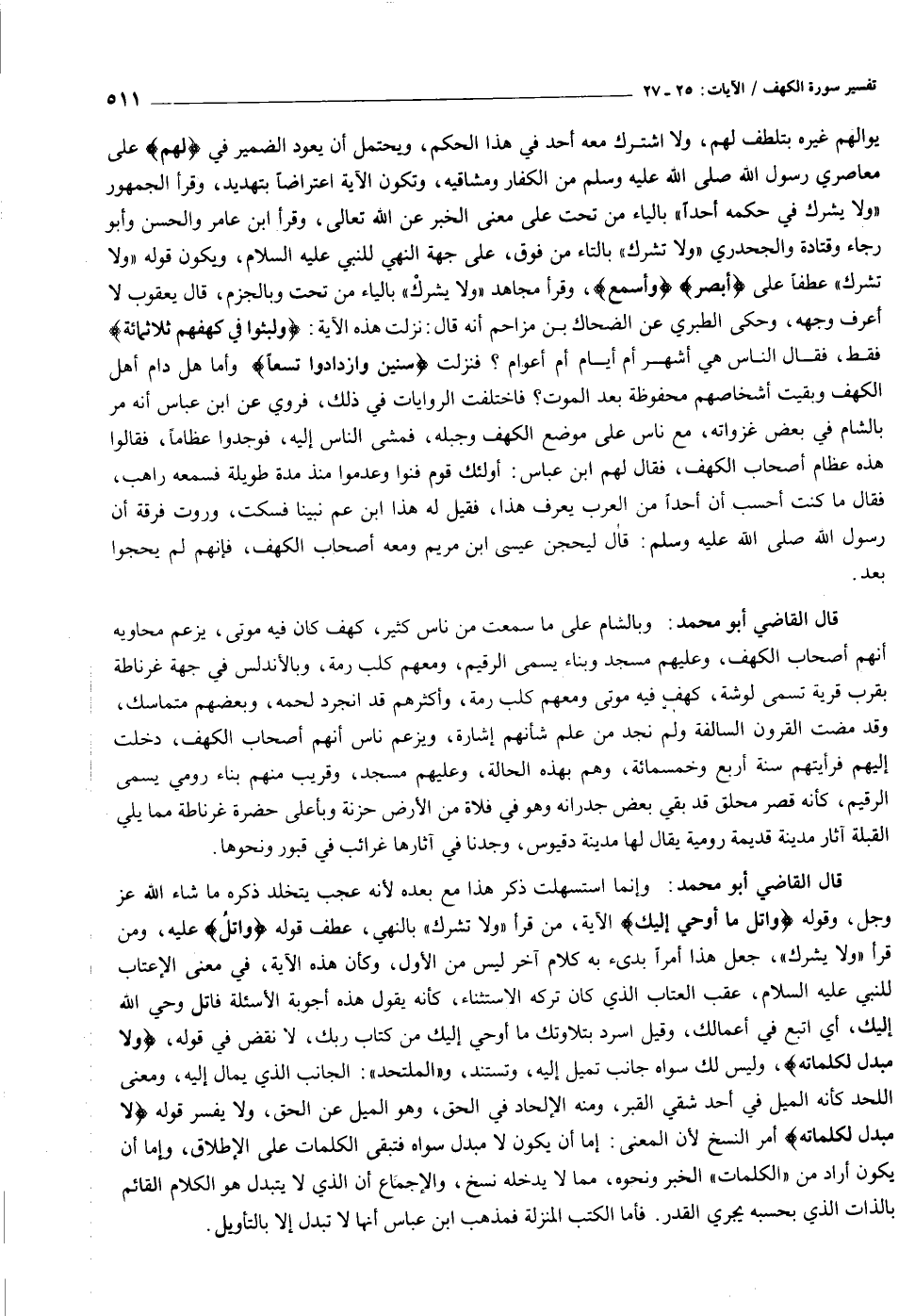 يوالهم غيره بتلطف لهم، ولا اشترك معه أحد في هذا الحكم، ويحتمل أن يعود الضمير في لَهُمْ على معاصري رسول الله صلى الله عليه وسلم من الكفار ومشاقيه، وتكون الآية اعتراضا بتهديد، وقرأ الجمهور «ولا يشرك في حكمه أحدا» بالياء من تحت على معنى الخبر عن الله تعالى، وقرأ ابن عامر والحسن وأبو رجاء وقتادة والجحدري «ولا تشرك» بالتاء من فوق، على جهة النهي للنبي عليه السلام، ويكون قوله «ولا تشرك» عطفا على أَبْصِرْ وَأَسْمِعْ، وقرأ مجاهد «ولا يشرك» بالياء من تحت وبالجزم، قال يعقوب لا أعرف وجهه، وحكى الطبري عن الضحاك بن مزاحم أنه قال: نزلت هذه الآية: وَلَبِثُوا فِي كَهْفِهِمْ ثَلاثَ مِائَةٍ فقط، فقال الناس هي أشهر أم أيام أم أعوام؟ فنزلت سِنِينَ وَازْدَادُوا تِسْعاً وأما هل دام أهل الكهف وبقيت أشخاصهم محفوظة بعد الموت؟ فاختلفت الروايات في ذلك، فروي عن ابن عباس أنه مر بالشام في بعض غزواته، مع ناس على موضع الكهف وجبله، فمشى الناس إليه، فوجدوا عظاما، فقالوا هذه عظام أصحاب الكهف، فقال لهم ابن عباس: أولئك قوم فنوا وعدموا منذ مدة طويلة فسمعه راهب، فقال ما كنت أحسب أن أحدا من العرب يعرف هذا، فقيل له هذا ابن عم نبينا فسكت، وروت فرقة أن رسول الله صلى الله عليه وسلم: قال ليحجن عيسى ابن مريم ومعه أصحاب الكهف، فإنهم لم يحجوا بعد.