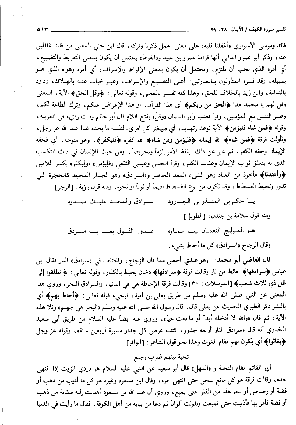 فائد وموسى الأسواري «أغفلنا قلبه» على معنى أهمل ذكرنا وتركه، قال ابن جني المعنى من ظننا غافلين عنه، وذكر أبو عمرو الداني أنها قراءة عمرو بن عبيد و «الفرط» يحتمل أن يكون بمعنى التفريط والتضييع، أي أمره الذي يجب أن يلتزم، ويحتمل أن يكون بمعنى الإفراط والإسراف، أي أمره وهواه الذي هو بسبيله، وقد فسره المتأولون بالعبارتين: أعني التضييع والإسراف، وعبر خباب عنه بالهلاك، وداود بالندامة، وابن زيد بالخلاف للحق، وهذا كله تفسير بالمعنى، وقوله تعالى: وَقُلِ الْحَقُّ الآية، المعنى وقل لهم يا محمد هذا الْحَقُّ مِنْ رَبِّكُمْ أي هذا القرآن، أو هذا الإعراض عنكم، وترك الطاعة لكم، وصبر النفس مع المؤمنين، وقرأ قعنب وأبو السمال «وقل» بفتح اللام قال أبو حاتم وذلك رديء في العربية، وقوله فَمَنْ شاءَ فَلْيُؤْمِنْ الآية توعد وتهديد، أي فليختر كل امرئ لنفسه ما يجده غدا عند الله عز وجل، وتأولت فرقة فَمَنْ شاءَ الله إيمانه فَلْيُؤْمِنْ وَمَنْ شاءَ الله كفره فَلْيَكْفُرْ، وهو متوجه، أي فحقه الإيمان وحقه الكفر، ثم عبر عن ذلك بلفظ الأمر الزما وتحريضا، ومن حيث للإنسان في ذلك التكسب الذي به يتعلق ثواب الإيمان وعقاب الكفر، وقرأ الحسن وعيسى الثقفي «فليؤمن» «وليكفر» بكسر اللامين وأَعْتَدْنا مأخوذ من العتاد وهو الشيء المعد الحاضر و «السرادق» وهو الجدار المحيط كالحجرة التي تدور وتحيط الفسطاط، وقد تكون من نوع الفسطاط أديما أو ثوبا أو نحوه، ومنه قول رؤبة: [الرجز]