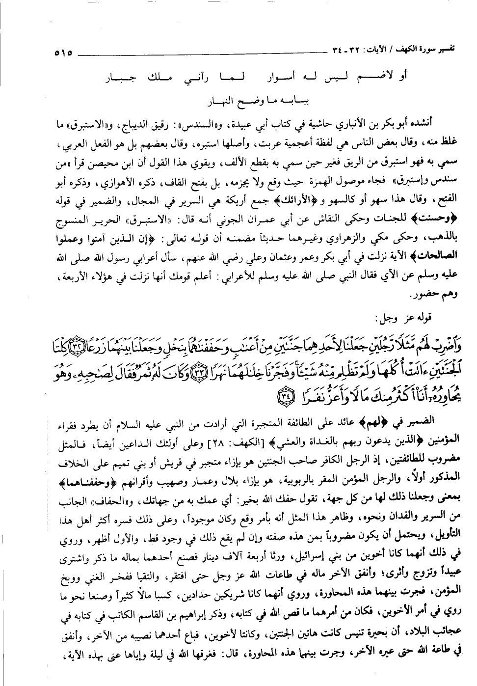 وَاضْرِبْ لَهُمْ مَثَلاً رَجُلَيْنِ جَعَلْنا لِأَحَدِهِما جَنَّتَيْنِ مِنْ أَعْنابٍ وَحَفَفْناهُما بِنَخْلٍ وَجَعَلْنا بَيْنَهُما زَرْعاً (٣٢) كِلْتَا الْجَنَّتَيْنِ آتَتْ أُكُلَها وَلَمْ تَظْلِمْ مِنْهُ شَيْئاً وَفَجَّرْنا خِلالَهُما نَهَراً (٣٣) وَكانَ لَهُ ثَمَرٌ فَقالَ لِصاحِبِهِ وَهُوَ يُحاوِرُهُ أَنَا أَكْثَرُ مِنْكَ مالاً وَأَعَزُّ نَفَراً (٣٤)