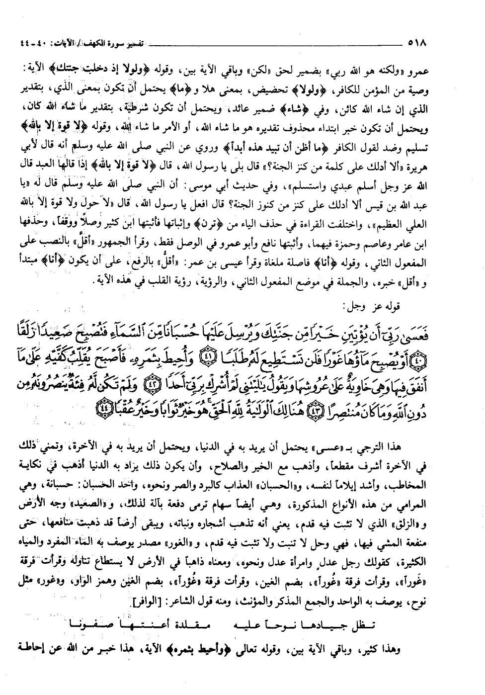 هذا الترجي ب «عسى» يحتمل أن يريد به في الدنيا، ويحتمل أن يريد به في الآخرة، وتمني ذلك في الآخرة أشرف مقطعا، وأذهب مع الخير والصلاح، وأن يكون ذلك يراد به الدنيا أذهب في نكاية المخاطب، وأشد إيلاما لنفسه، و «الحسبان» العذاب كالبرد والصر ونحوه، واحد الحسبان: حسبانة، وهي المرامي من هذه الأنواع المذكورة، وهي أيضا سهام ترمى دفعة بآلة لذلك، و «الصعيد» وجه الأرض و «الزلق» الذي لا تثبت فيه قدم، يعني أنه تذهب أشجاره ونباته، ويبقى أرضا قد ذهبت منافعها، حتى منفعة المشي فيها، فهي وحل لا تنبت ولا تثبت فيه قدم، و «الغور» مصدر يوصف به الماء المفرد والمياه الكثيرة، كقولك رجل عدل وامرأة عدل ونحوه، ومعناه ذاهبا في الأرض لا يستطاع تناوله وقرأت فرقة «غورا» ، وقرأت فرقة «غورا» ، بضم الغين، وقرأت فرقة «غؤرا» ، بضم الغين وهمز الواو، و «غور» مثل نوح، يوصف به الواحد والجمع المذكر والمؤنث، ومنه قول الشاعر: [الوافر] .