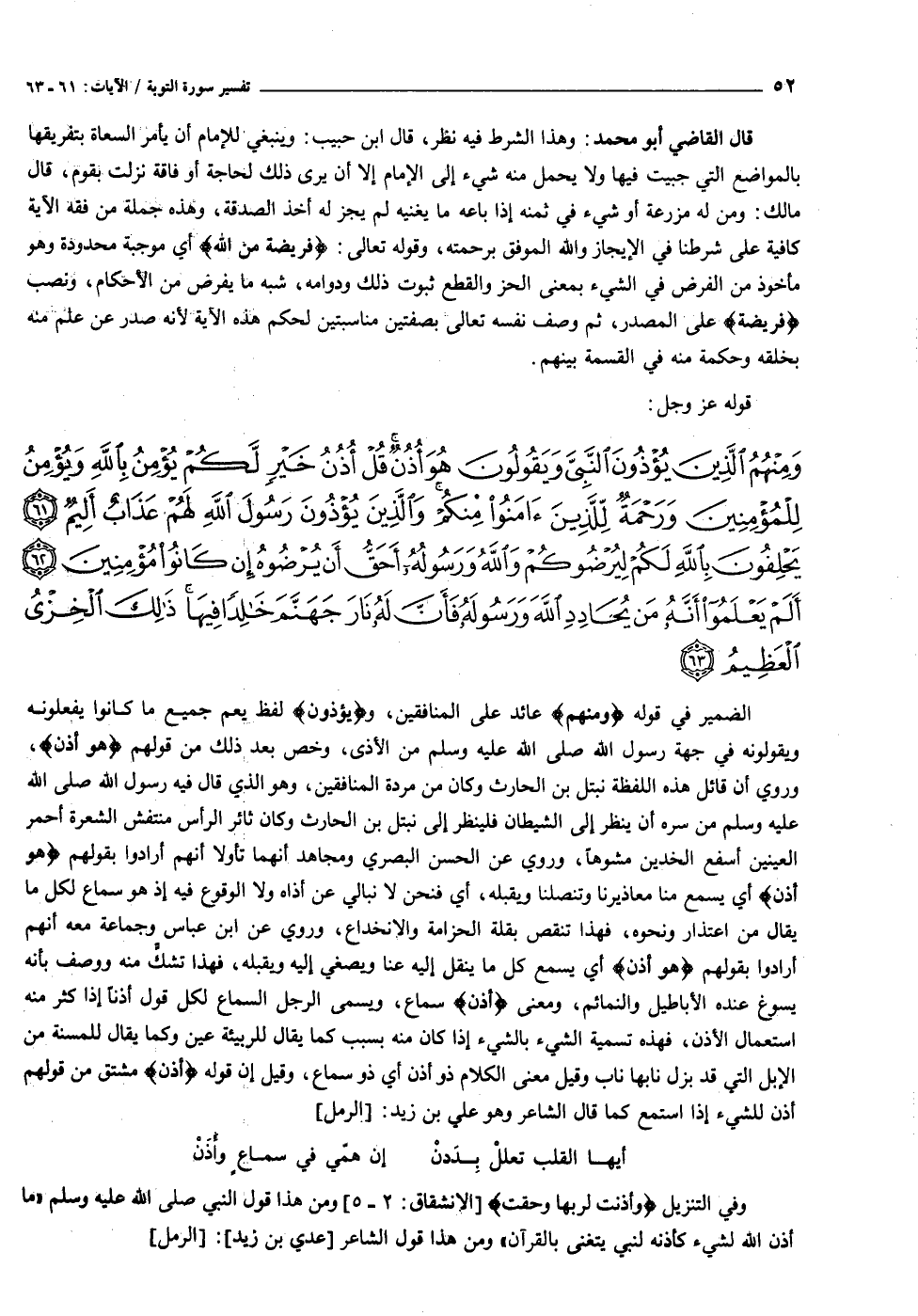 وَمِنْهُمُ الَّذِينَ يُؤْذُونَ النَّبِيَّ وَيَقُولُونَ هُوَ أُذُنٌ قُلْ أُذُنُ خَيْرٍ لَكُمْ يُؤْمِنُ بِاللَّهِ وَيُؤْمِنُ لِلْمُؤْمِنِينَ وَرَحْمَةٌ لِلَّذِينَ آمَنُوا مِنْكُمْ وَالَّذِينَ يُؤْذُونَ رَسُولَ اللَّهِ لَهُمْ عَذابٌ أَلِيمٌ (٦١) يَحْلِفُونَ بِاللَّهِ لَكُمْ لِيُرْضُوكُمْ وَاللَّهُ وَرَسُولُهُ أَحَقُّ أَنْ يُرْضُوهُ إِنْ كانُوا مُؤْمِنِينَ (٦٢) أَلَمْ يَعْلَمُوا أَنَّهُ مَنْ يُحادِدِ اللَّهَ وَرَسُولَهُ فَأَنَّ لَهُ نارَ جَهَنَّمَ خالِداً فِيها ذلِكَ الْخِزْيُ الْعَظِيمُ (٦٣)