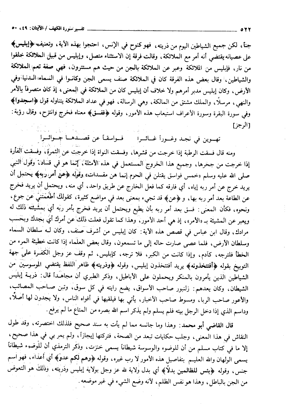 جنا، لكن جميع الشياطين اليوم من ذريته، فهو كنوح في الإنس، احتجوا بهذه الآية، وتعنيف إِبْلِيسَ على عصيانه يقتضي أنه أمر مع الملائكة، وقالت فرقة إن الاستثناء متصل، وإبليس من قبيل الملائكة خلقوا من نار، فإبليس من الملائكة وعبر عن الملائكة بالجن من حيث هم مستترون، فهي صفة تعم الملائكة والشياطين، وقال بعض هذه الفرقة كان في الملائكة صنف يسمى الجن وكانوا في السماء الدنيا وفي الأرض، وكان إبليس مدبر أمرهم ولا خلاف أن إبليس كان من الملائكة في المعنى، إذ كان متصرفا بالأمر والنهي، مرسلا، والملك مشتق من المالكة، وهي الرسالة، فهو في عداد الملائكة يتناوله قول اسْجُدُوا وفي سورة البقرة وسورة الأعراف استيعاب هذه الأمور، وقوله فَفَسَقَ معناه فخرج وانتزح، وقال رؤبة: