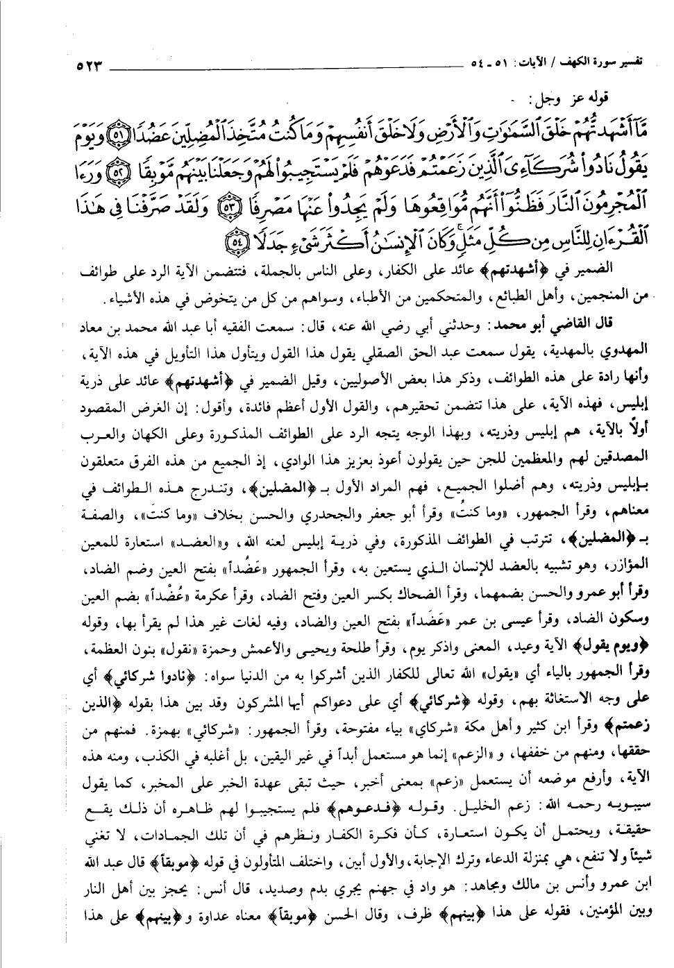 قال القاضي أبو محمد: وحدثني أبي رضي الله عنه، قال: سمعت الفقيه أبا عبد الله محمد بن معاد المهدوي بالمهدية، يقول سمعت عبد الحق الصقلي يقول هذا القول ويتأول هذا التأويل في هذه الآية، وأنها رادة على هذه الطوائف، وذكر هذا بعض الأصوليين، وقيل الضمير في أَشْهَدْتُهُمْ عائد على ذرية إبليس، فهذه الآية، على هذا تتضمن تحقيرهم، والقول الأول أعظم فائدة، وأقول: إن الغرض المقصود أولا بالآية، هم إبليس وذريته، وبهذا الوجه يتجه الرد على الطوائف المذكورة وعلى الكهان والعرب المصدقين لهم والمعظمين للجن حين يقولون أعوذ بعزيز هذا الوادي، إذ الجميع من هذه الفرق متعلقون بإبليس وذريته، وهم أضلوا الجميع، فهم المراد الأول ب الْمُضِلِّينَ، وتندرج هذه الطوائف في معناهم، وقرأ الجمهور، «وما كنت» وقرأ أبو جعفر والجحدري والحسن بخلاف «وما كنت» ، والصفة ب الْمُضِلِّينَ، تترتب في الطوائف المذكورة، وفي ذرية إبليس لعنه الله، و «العضد» استعارة للمعين المؤازر، وهو تشبيه بالعضد للإنسان الذي يستعين به، وقرأ الجمهور «عضدا» بفتح العين وضم الضاد، وقرأ أبو عمرو والحسن بضمهما، وقرأ الضحاك بكسر العين وفتح الضاد، وقرأ عكرمة «عضدا» بضم العين وسكون الضاد، وقرأ عيسى بن عمر «عضدا» بفتح العين والضاد، وفيه لغات غير هذا لم يقرأ بها، وقوله وَيَوْمَ يَقُولُ الآية وعيد، المعنى واذكر يوم، وقرأ طلحة ويحيى والأعمش وحمزة «نقول» بنون العظمة، وقرأ الجمهور بالياء أي «يقول» الله تعالى للكفار الذين أشركوا به من الدنيا سواه: نادُوا شُرَكائِيَ أي على وجه الاستغاثة بهم، وقوله شُرَكائِيَ أي على دعواكم أيها المشركون وقد بين هذا بقوله الَّذِينَ زَعَمْتُمْ وقرأ ابن كثير وأهل مكة «شركائي» بياء مفتوحة، وقرأ الجمهور: «شركائي» بهمزة. فمنهم من حققها، ومنهم من خففها، و «الزعم» إنما هو مستعمل أبدا في غير اليقين، بل أغلبه في الكذب، ومنه هذه الآية، وأرفع موضعه أن يستعمل «زعم» بمعنى أخبر، حيث تبقى عهدة الخبر على المخبر، كما يقول سيبويه رحمه الله: زعم الخليل. وقوله فَدَعَوْهُمْ فلم يستجيبوا لهم ظاهره أن ذلك يقع حقيقة، ويحتمل أن يكون استعارة، كأن فكرة الكفار ونظرهم في أن تلك الجمادات، لا تغني شيئا ولا تنفع، هي بمنزلة الدعاء وترك الإجابة، والأول أبين، واختلف المتأولون في قوله مَوْبِقاً قال عبد الله ابن عمرو وأنس بن مالك ومجاهد: هو واد في جهنم يجري بدم وصديد، قال أنس: يحجز بين أهل النار وبين المؤمنين، فقوله على هذا بَيْنَهُمْ ظرف، وقال الحسن مَوْبِقاً معناه عداوة وبَيْنَهُمْ على هذا