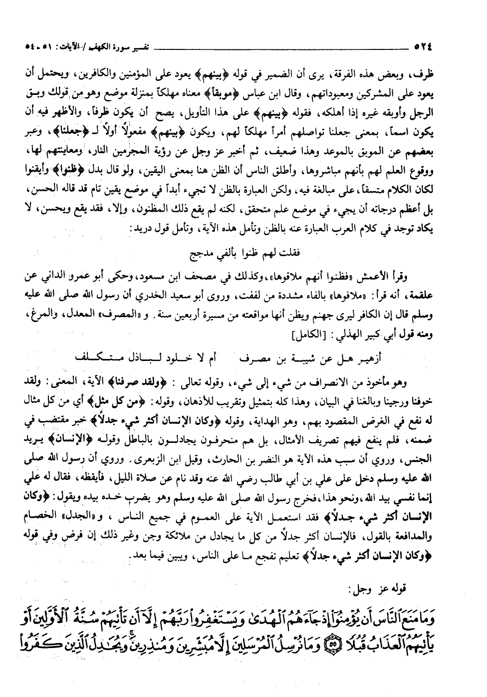 وهو مأخوذ من الانصراف من شيء إلى شيء، وقوله تعالى: وَلَقَدْ صَرَّفْنا الآية، المعنى: ولقد خوفنا ورجينا وبالغنا في البيان، وهذا كله بتمثيل وتقريب للأذهان، وقوله: مِنْ كُلِّ مَثَلٍ أي من كل مثال له نفع في الغرض المقصود بهم، وهو الهداية، وقوله وَكانَ الْإِنْسانُ أَكْثَرَ شَيْءٍ جَدَلًا خبر مقتضب في ضمنه، فلم ينفع فيهم تصريف الأمثال، بل هم منحرفون يجادلون بالباطل وقوله الْإِنْسانُ يريد الجنس، وروي أن سبب هذه الآية هو النضر بن الحارث، وقيل ابن الزبعرى. وروي أن رسول الله صلى الله عليه وسلم دخل على علي بن أبي طالب رضي الله عنه وقد نام عن صلاة الليل، فأيقظه، فقال له علي إنما نفسي بيد الله، ونحو هذا، فخرج رسول الله صلى الله عليه وسلم وهو يضرب خده بيده ويقول: وَكانَ الْإِنْسانُ أَكْثَرَ شَيْءٍ جَدَلًا فقد استعمل الآية على العموم في جميع الناس، و «الجدل» الخصام والمدافعة بالقول، فالإنسان أكثر جدلا من كل ما يجادل من ملائكة وجن وغير ذلك إن فرض وفي قوله وَكانَ الْإِنْسانُ أَكْثَرَ شَيْءٍ جَدَلًا تعليم تفجع ما على الناس، ويبين فيما بعد.