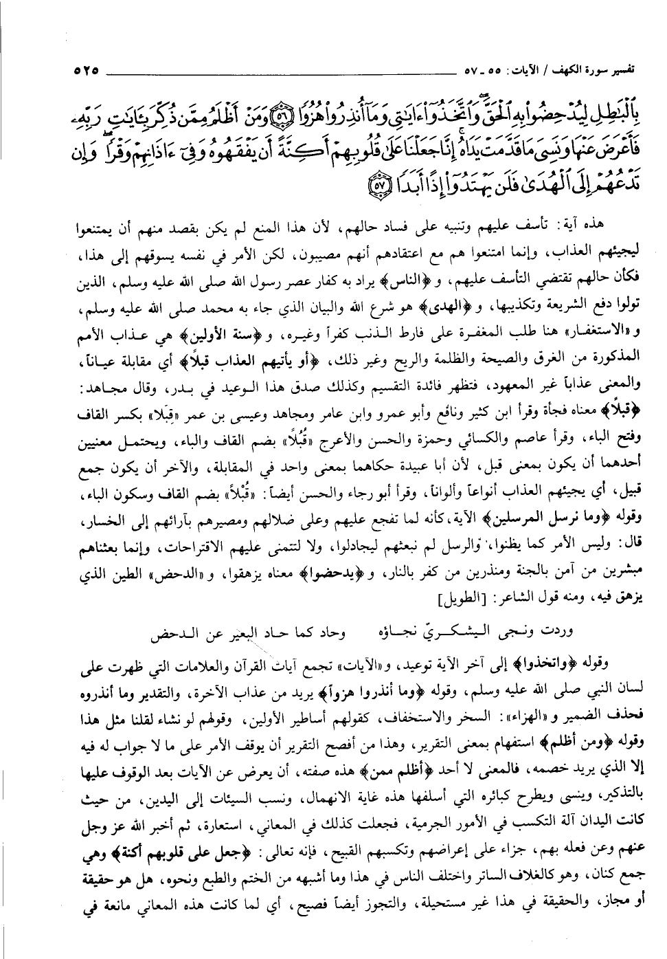 هذه آية: تأسف عليهم وتنبيه على فساد حالهم، لأن هذا المنع لم يكن بقصد منهم أن يمتنعوا ليجيئهم العذاب، وإنما امتنعوا هم مع اعتقادهم أنهم مصيبون، لكن الأمر في نفسه يسوقهم إلى هذا، فكأن حالهم تقتضي التأسف عليهم، والنَّاسَ يراد به كفار عصر رسول الله صلى الله عليه وسلم، الذين تولوا دفع الشريعة وتكذيبها، والْهُدى هو شرع الله والبيان الذي جاء به محمد صلى الله عليه وسلم، و «الاستغفار» هنا طلب المغفرة على فارط الذنب كفرا وغيره، وسُنَّةُ الْأَوَّلِينَ هي عذاب الأمم المذكورة من الغرق والصيحة والظلمة والريح وغير ذلك، أَوْ يَأْتِيَهُمُ الْعَذابُ قُبُلًا أي مقابلة عيانا، والمعنى عذابا غير المعهود، فتظهر فائدة التقسيم وكذلك صدق هذا الوعيد في بدر، وقال مجاهد: