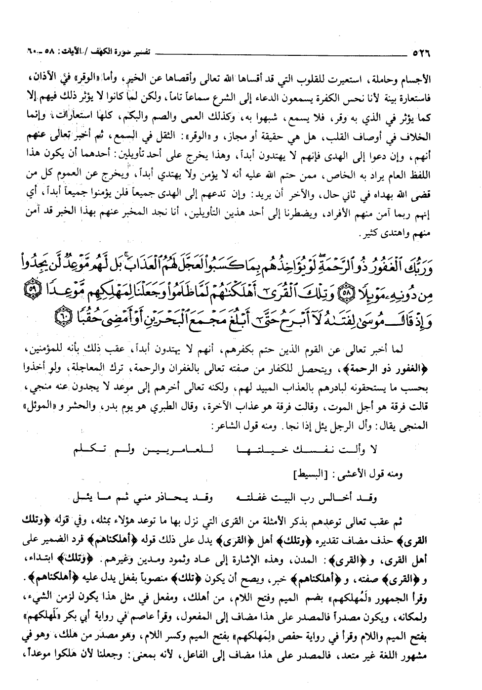 وَرَبُّكَ الْغَفُورُ ذُو الرَّحْمَةِ لَوْ يُؤاخِذُهُمْ بِما كَسَبُوا لَعَجَّلَ لَهُمُ الْعَذابَ بَلْ لَهُمْ مَوْعِدٌ لَنْ يَجِدُوا مِنْ دُونِهِ مَوْئِلاً (٥٨) وَتِلْكَ الْقُرى أَهْلَكْناهُمْ لَمَّا ظَلَمُوا وَجَعَلْنا لِمَهْلِكِهِمْ مَوْعِداً (٥٩) وَإِذْ قالَ مُوسى لِفَتاهُ لا أَبْرَحُ حَتَّى أَبْلُغَ مَجْمَعَ الْبَحْرَيْنِ أَوْ أَمْضِيَ حُقُباً (٦٠)