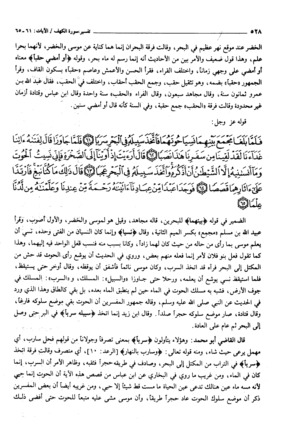 الخضر عند موقع نهر عظيم في البحر، وقالت فرقة البحران إنما هما كناية عن موسى والخضر، لأنهما بحرا علم، وهذا قول ضعيف والأمر بين من الأحاديث أنه إنما رسم له ماء بحر، وقوله أَوْ أَمْضِيَ حُقُباً معناه أو أمضي على وجهي زمانا، واختلف القراء، فقرأ الحسن والأعمش وعاصم «حقبا» بسكون القاف، وقرأ الجمهور «حقبا» بضمه، وهو تثقيل حقب، وجمع الحقب أحقاب، واختلف في الحقب، فقال عبد الله بن عمرو ثمانون سنة، وقال مجاهد سبعون، وقال الفراء «الحقب» سنة واحدة وقال ابن عباس وقتادة أزمان غير محدودة وقالت فرقة «الحقب» جمع حقبة، وفي السنة كأنه قال أو أمضي سنين.