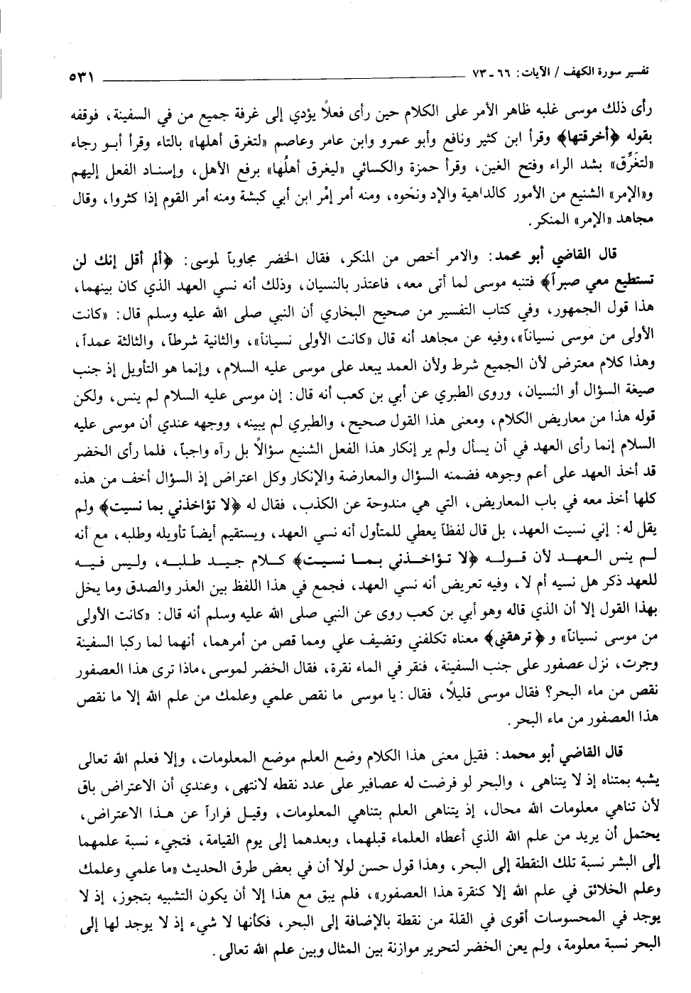قال القاضي أبو محمد: والأمر أخص من المنكر، فقال الخضر مجاوبا لموسى: أَلَمْ أَقُلْ إِنَّكَ لَنْ تَسْتَطِيعَ مَعِيَ صَبْراً فتنبه موسى لما أتى معه، فاعتذر بالنسيان، وذلك أنه نسي العهد الذي كان بينهما، هذا قول الجمهور، وفي كتاب التفسير من صحيح البخاري أن النبي صلى الله عليه وسلم قال: «كانت الأولى من موسى نسيانا» ، وفيه عن مجاهد أنه قال «كانت الأولى نسيانا» ، والثانية شرطا، والثالثة عمدا، وهذا كلام معترض لأن الجميع شرط ولأن العمد يبعد على موسى عليه السلام، وإنما هو التأويل إذ جنب صيغة السؤال أو النسيان، وروى الطبري عن أبي بن كعب أنه قال: إن موسى عليه السلام لم ينس، ولكن قوله هذا من معاريض الكلام، ومعنى هذا القول صحيح، والطبري لم يبينه، ووجهه عندي أن موسى عليه السلام إنما رأى العهد في أن يسأل ولم ير إنكار هذا الفعل الشنيع سؤالا بل رآه واجبا، فلما رأى الخضر قد أخذ العهد على أعم وجوهه فضمنه السؤال والمعارضة والإنكار وكل اعتراض إذ السؤال أخف من هذه كلها أخذ معه في باب المعاريض، التي هي مندوحة عن الكذب، فقال له لا تُؤاخِذْنِي بِما نَسِيتُ ولم يقل له: إني نسيت العهد، بل قال لفظا يعطي للمتأول أنه نسي العهد، ويستقيم أيضا تأويله وطلبه، مع أنه لم ينس العهد لأن قوله لا تُؤاخِذْنِي بِما نَسِيتُ كلام جيد طلبه، وليس فيه للعهد ذكر هل نسيه أم لا، وفيه تعريض أنه نسي العهد، فجمع في هذا اللفظ بين العذر والصدق وما يخل بهذا القول إلا أن الذي قاله وهو أبي بن كعب روى عن النبي صلى الله عليه وسلم أنه قال: «كانت الأولى من موسى نسيانا» وتُرْهِقْنِي معناه تكلفني وتضيف علي ومما قص من أمرهما، أنهما لما ركبا السفينة وجرت، نزل عصفور على جنب السفينة، فنقر في الماء نقرة، فقال الخضر لموسى، ماذا ترى هذا العصفور نقص من ماء البحر؟ فقال موسى قليلا، فقال: يا موسى ما نقص علمي وعلمك من علم الله إلا ما نقص هذا العصفور من ماء البحر.