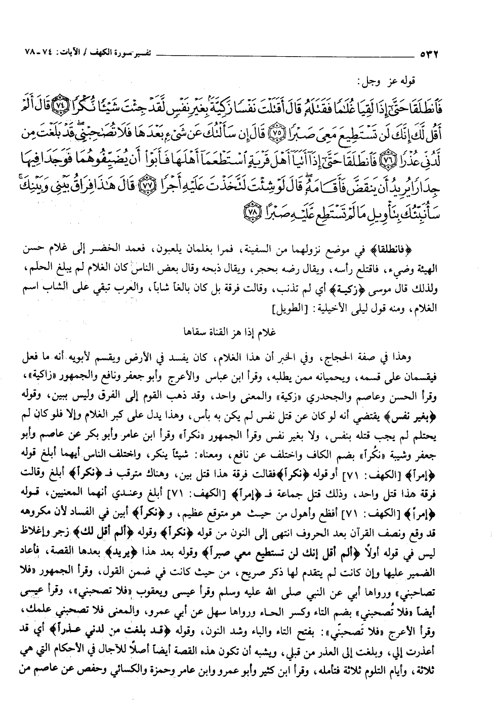 فَانْطَلَقا في موضع نزولهما من السفينة، فمرا بغلمان يلعبون، فعمد الخضر إلى غلام حسن الهيئة وضيء، فاقتلع رأسه، ويقال رضه بحجر، ويقال ذبحه وقال بعض الناس كان الغلام لم يبلغ الحلم، ولذلك قال موسى زَكِيَّةً أي لم تذنب، وقالت فرقة بل كان بالغا شابا، والعرب تبقي على الشاب اسم الغلام، ومنه قول ليلى الأخيلية: [الطويل] غلام إذا هز القناة سقاها وهذا في صفة الحجاج، وفي الخبر أن هذا الغلام، كان يفسد في الأرض ويقسم لأبويه أنه ما فعل فيقسمان على قسمه، ويحميانه ممن يطلبه، وقرأ ابن عباس والأعرج وأبو جعفر ونافع والجمهور «زاكية» ، وقرأ الحسن وعاصم والجحدري «زكية» والمعنى واحد، وقد ذهب القوم إلى الفرق وليس ببين، وقوله بِغَيْرِ نَفْسٍ يقتضي أنه لو كان عن قتل نفس لم يكن به بأس، وهذا يدل على كبر الغلام وإلا فلو كان لم يحتلم لم يجب قتله بنفس، ولا بغير نفس وقرأ الجمهور «نكرا» وقرأ ابن عامر وأبو بكر عن عاصم وأبو جعفر وشيبة «نكرا» بضم الكاف واختلف عن نافع، ومعناه: شيئا ينكر، واختلف الناس أيهما أبلغ قوله إِمْراً [الكهف: ٧١] أو قوله نُكْراً فقالت فرقة هذا قتل بين، وهناك مترقب ف نُكْراً أبلغ وقالت فرقة هذا قتل واحد، وذلك قتل جماعة ف إِمْراً [الكهف: ٧١] أبلغ وعندي أنهما المعنيين، قوله إِمْراً [الكهف: ٧١] أفظع وأهول من حيث هو متوقع عظيم، ونُكْراً أبين في الفساد لأن مكروهه قد وقع ونصف القرآن بعد الحروف انتهى إلى النون من قوله نُكْراً وقوله أَلَمْ أَقُلْ لَكَ زجر وإغلاظ ليس في قوله أولا أَلَمْ أَقُلْ إِنَّكَ لَنْ تَسْتَطِيعَ مَعِيَ صَبْراً وقوله بعد هذا يُرِيدُ بعدها القصة، فأعاد الضمير عليها وإن كانت لم يتقدم لها ذكر صريح، من حيث كانت في ضمن القول، وقرأ الجمهور «فلا تصاحبني» ورواها أبي عن النبي صلى الله عليه وسلم وقرأ عيسى ويعقوب «فلا تصحبني» ، وقرأ عيسى أيضا «فلا تصحبني» بضم التاء وكسر الحاء ورواها سهل عن أبي عمرو، والمعنى فلا تصحبني علمك، وقرأ الأعرج «فلا تصحبنّي» : بفتح التاء والباء وشد النون، وقوله قَدْ بَلَغْتَ مِنْ لَدُنِّي عُذْراً أي قد أعذرت إلي، وبلغت إلى العذر من قبلي، ويشبه أن تكون هذه القصة أيضا أصلا للآجال في الأحكام التي هي ثلاثة، وأيام التلوم ثلاثة فتأمله، وقرأ ابن كثير وأبو عمرو وابن عامر وحمزة والكسائي وحفص عن عاصم من