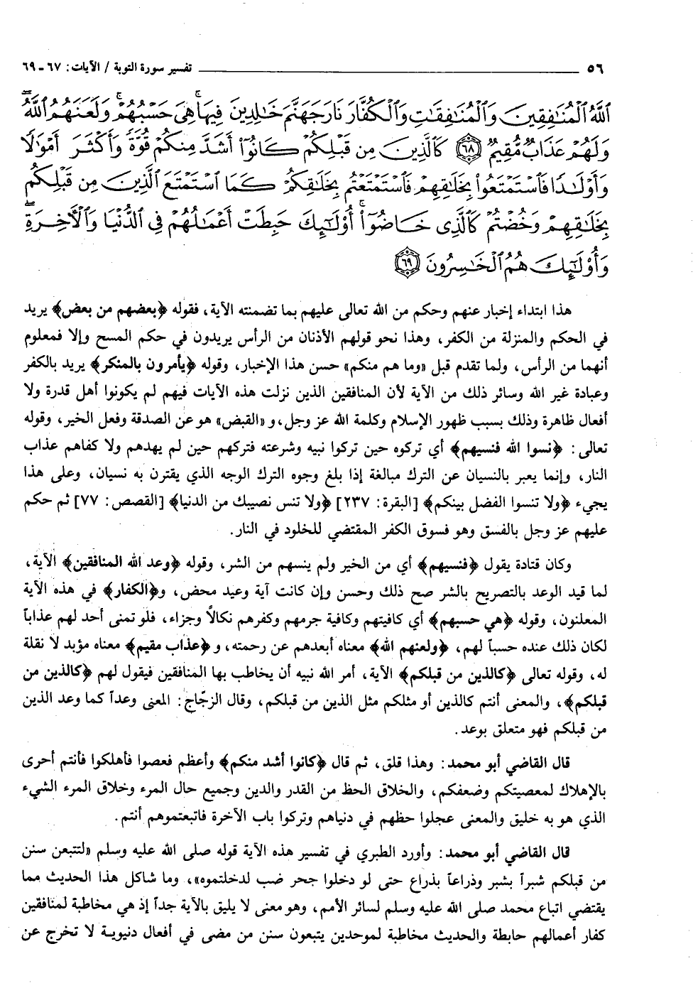 وكان قتادة يقول فَنَسِيَهُمْ أي من الخير ولم ينسهم من الشر، وقوله وَعَدَ اللَّهُ الْمُنافِقِينَ الآية، لما قيد الوعد بالتصريح بالشر صح ذلك وحسن وإن كانت آية وعيد محض، والْكُفَّارَ في هذه الآية المعلنون، وقوله هِيَ حَسْبُهُمْ أي كافيتهم وكافية جرمهم وكفرهم نكالا وجزاء، فلو تمنى أحد لهم عذابا لكان ذلك عنده حسبا لهم، وَلَعَنَهُمُ اللَّهُ معناه أبعدهم عن رحمته، وعَذابٌ مُقِيمٌ معناه مؤبد لا نقلة له، وقوله تعالى كَالَّذِينَ مِنْ قَبْلِكُمْ الآية، أمر الله نبيه أن يخاطب بها المنافقين فيقول لهم كَالَّذِينَ مِنْ قَبْلِكُمْ، والمعنى أنتم كالذين أو مثلكم مثل الذين من قبلكم، وقال الزجّاج: المعنى وعدا كما وعد الذين من قبلكم فهو متعلق بوعد.
