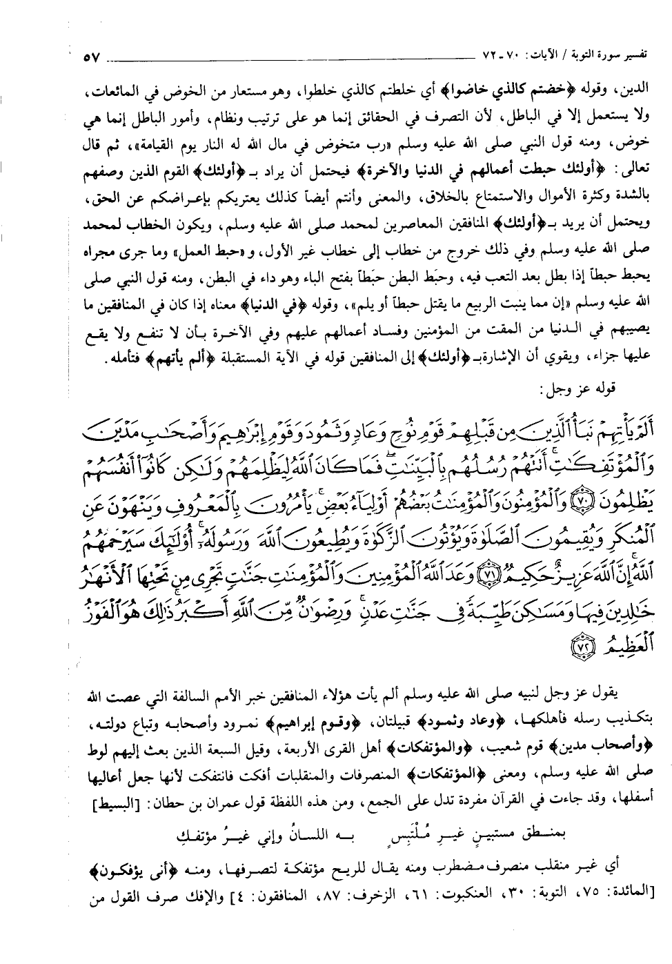 أَلَمْ يَأْتِهِمْ نَبَأُ الَّذِينَ مِنْ قَبْلِهِمْ قَوْمِ نُوحٍ وَعادٍ وَثَمُودَ وَقَوْمِ إِبْراهِيمَ وَأَصْحابِ مَدْيَنَ وَالْمُؤْتَفِكاتِ أَتَتْهُمْ رُسُلُهُمْ بِالْبَيِّناتِ فَما كانَ اللَّهُ لِيَظْلِمَهُمْ وَلكِنْ كانُوا أَنْفُسَهُمْ يَظْلِمُونَ (٧٠) وَالْمُؤْمِنُونَ وَالْمُؤْمِناتُ بَعْضُهُمْ أَوْلِياءُ بَعْضٍ يَأْمُرُونَ بِالْمَعْرُوفِ وَيَنْهَوْنَ عَنِ الْمُنْكَرِ وَيُقِيمُونَ الصَّلاةَ وَيُؤْتُونَ الزَّكاةَ وَيُطِيعُونَ اللَّهَ وَرَسُولَهُ أُولئِكَ سَيَرْحَمُهُمُ اللَّهُ إِنَّ اللَّهَ عَزِيزٌ حَكِيمٌ (٧١) وَعَدَ اللَّهُ الْمُؤْمِنِينَ وَالْمُؤْمِناتِ جَنَّاتٍ تَجْرِي مِنْ تَحْتِهَا الْأَنْهارُ خالِدِينَ فِيها وَمَساكِنَ طَيِّبَةً فِي جَنَّاتِ عَدْنٍ وَرِضْوانٌ مِنَ اللَّهِ أَكْبَرُ ذلِكَ هُوَ الْفَوْزُ الْعَظِيمُ (٧٢)