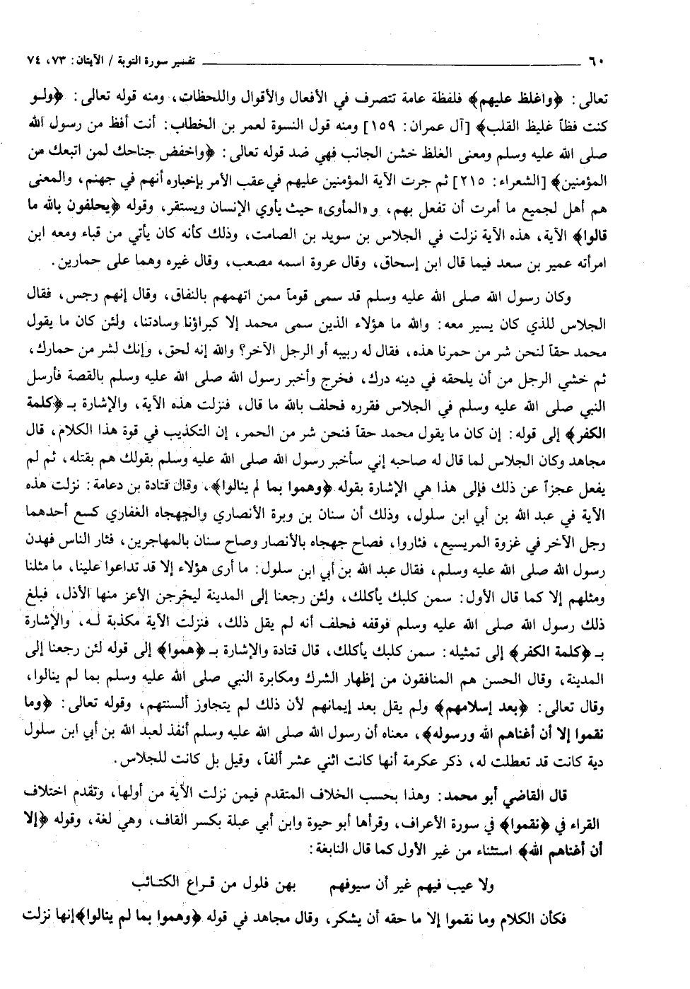 تعالى: وَاغْلُظْ عَلَيْهِمْ فلفظة عامة تتصرف في الأفعال والأقوال واللحظات، ومنه قوله تعالى: وَلَوْ كُنْتَ فَظًّا غَلِيظَ الْقَلْبِ [آل عمران: ١٥٩] ومنه قول النسوة لعمر بن الخطاب: أنت أفظ من رسول الله صلى الله عليه وسلم ومعنى الغلظ خشن الجانب فهي ضد قوله تعالى: وَاخْفِضْ جَناحَكَ لِمَنِ اتَّبَعَكَ مِنَ الْمُؤْمِنِينَ [الشعراء: ٢١٥] ثم جرت الآية المؤمنين عليهم في عقب الأمر بإخباره أنهم في جهنم، والمعنى هم أهل لجميع ما أمرت أن تفعل بهم، و «المأوى» حيث يأوي الإنسان ويستقر، وقوله يَحْلِفُونَ بِاللَّهِ ما قالُوا الآية، هذه الآية نزلت في الجلاس بن سويد بن الصامت، وذلك كأنه كان يأتي من قباء ومعه ابن امرأته عمير بن سعد فيما قال ابن إسحاق، وقال عروة اسمه مصعب، وقال غيره وهما على حمارين.