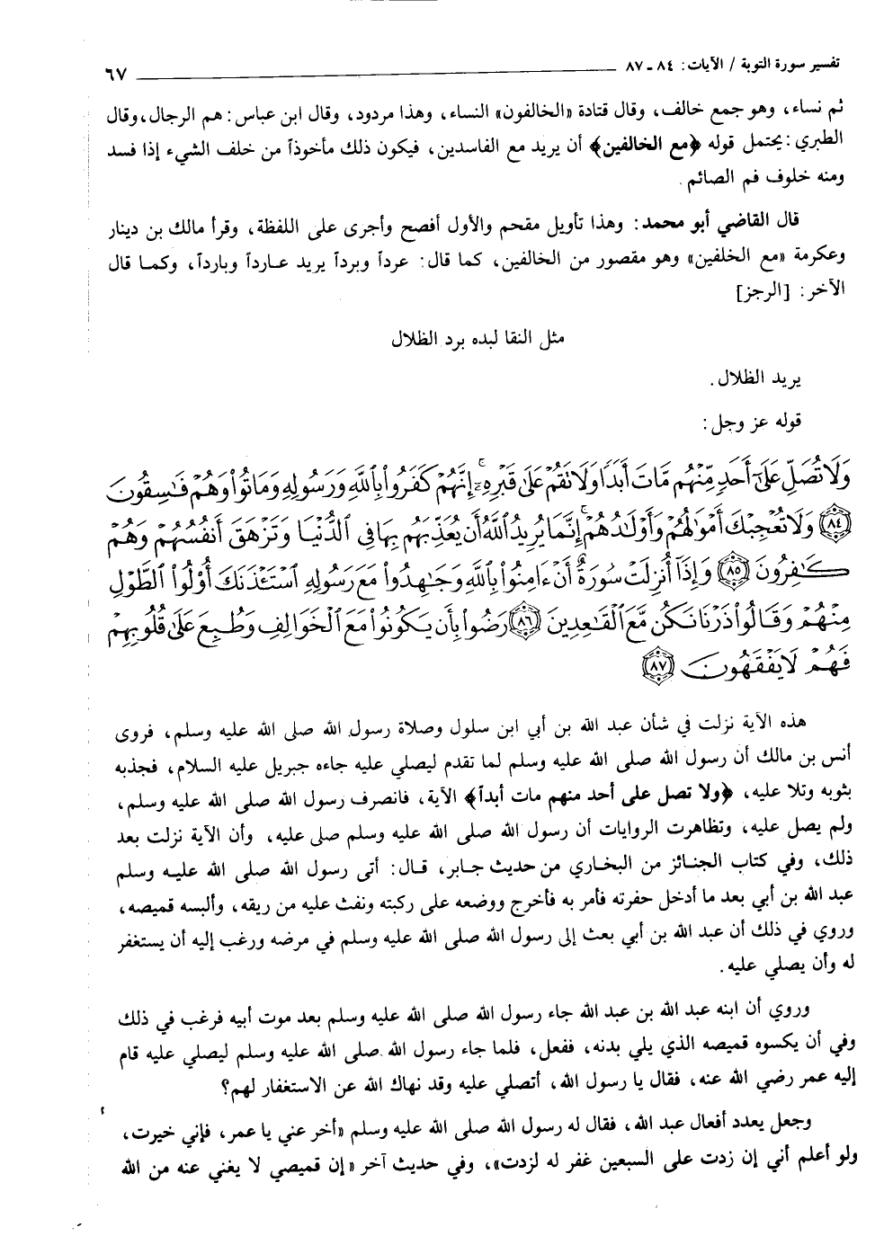 وَلا تُصَلِّ عَلى أَحَدٍ مِنْهُمْ ماتَ أَبَداً وَلا تَقُمْ عَلى قَبْرِهِ إِنَّهُمْ كَفَرُوا بِاللَّهِ وَرَسُولِهِ وَماتُوا وَهُمْ فاسِقُونَ (٨٤) وَلا تُعْجِبْكَ أَمْوالُهُمْ وَأَوْلادُهُمْ إِنَّما يُرِيدُ اللَّهُ أَنْ يُعَذِّبَهُمْ بِها فِي الدُّنْيا وَتَزْهَقَ أَنْفُسُهُمْ وَهُمْ كافِرُونَ (٨٥) وَإِذا أُنْزِلَتْ سُورَةٌ أَنْ آمِنُوا بِاللَّهِ وَجاهِدُوا مَعَ رَسُولِهِ اسْتَأْذَنَكَ أُولُوا الطَّوْلِ مِنْهُمْ وَقالُوا ذَرْنا نَكُنْ مَعَ الْقاعِدِينَ (٨٦) رَضُوا بِأَنْ يَكُونُوا مَعَ الْخَوالِفِ وَطُبِعَ عَلى قُلُوبِهِمْ فَهُمْ لا يَفْقَهُونَ (٨٧)