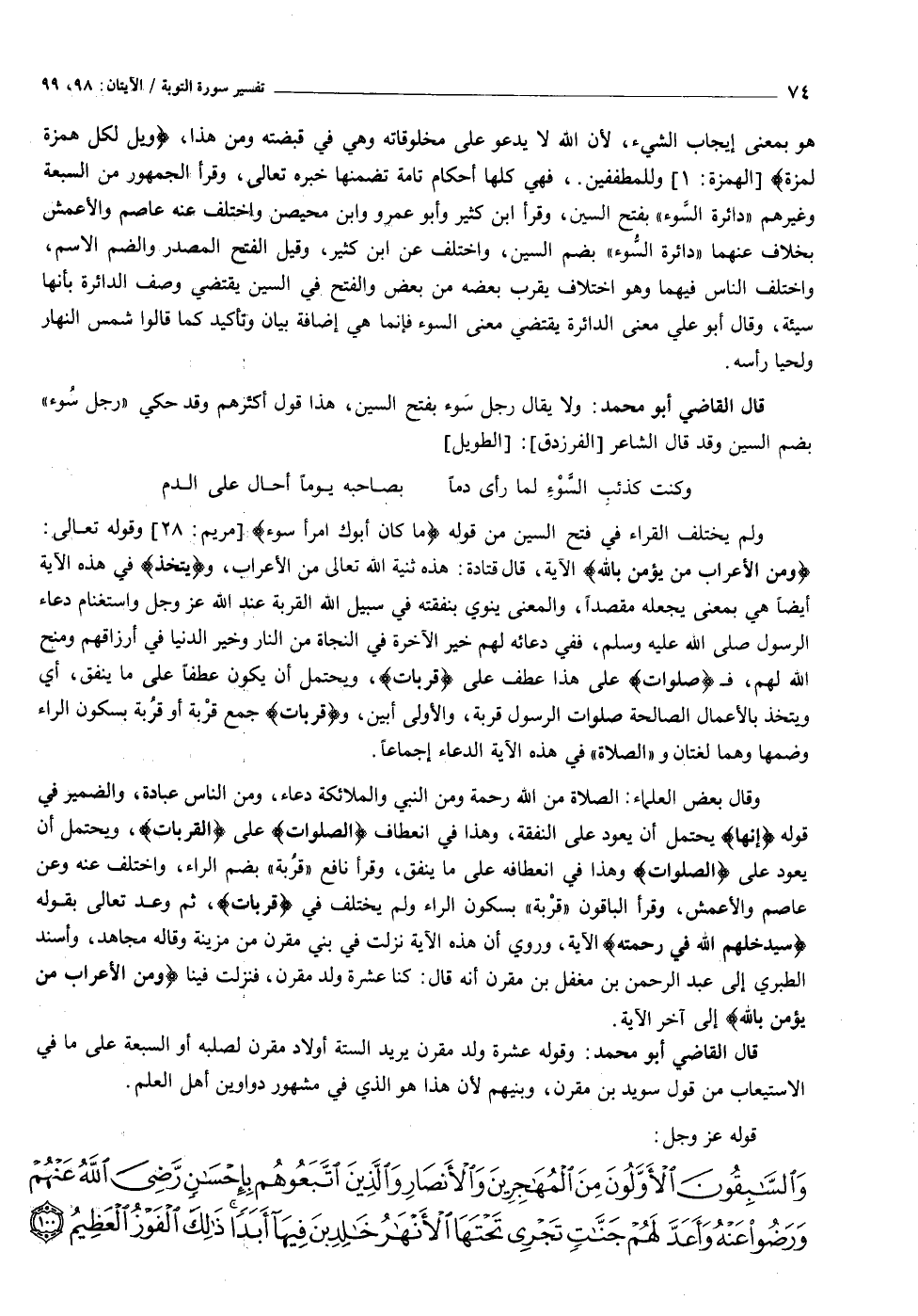وقال بعض العلماء: الصلاة من الله رحمة ومن النبي والملائكة دعاء، ومن الناس عبادة، والضمير في قوله إِنَّها يحتمل أن يعود على النفقة، وهذا في انعطاف «الصلوات» على «القربات» ، ويحتمل أن يعود على الصلوات وهذا في انعطافه على ما ينفق، وقرأ نافع «قربة» بضم الراء، واختلف عنه وعن عاصم والأعمش، وقرأ الباقون «قربة» بسكون الراء ولم يختلف في قُرُباتٍ، ثم وعد تعالى بقوله سَيُدْخِلُهُمُ اللَّهُ فِي رَحْمَتِهِ الآية، وروي أن هذه الآية نزلت في بني مقرن من مزينة وقاله مجاهد، وأسند الطبري إلى عبد الرحمن بن مغفل بن مقرن أنه قال: كنا عشرة ولد مقرن، فنزلت فينا وَمِنَ الْأَعْرابِ مَنْ يُؤْمِنُ بِاللَّهِ إلى آخر الآية.