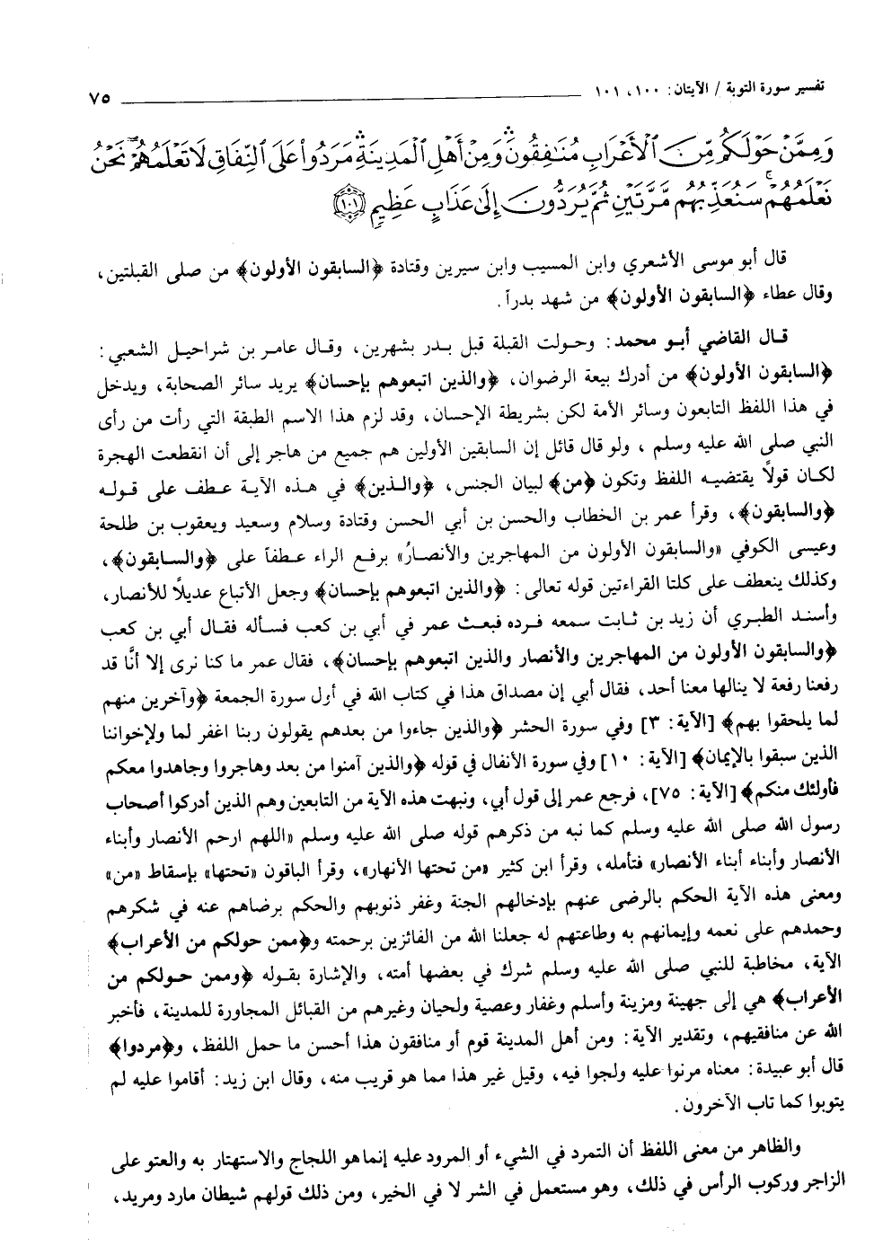 السَّابِقُونَ الْأَوَّلُونَ من أدرك بيعة الرضوان، وَالَّذِينَ اتَّبَعُوهُمْ بِإِحْسانٍ يريد سائر الصحابة، ويدخل في هذا اللفظ التابعون وسائر الأمة لكن بشريطة الإحسان، وقد لزم هذا الاسم الطبقة التي رأت من رأى النبي صلى الله عليه وسلم، ولو قال قائل إن السابقين الأولين هم جميع من هاجر إلى أن انقطعت الهجرة لكان قولا يقتضيه اللفظ وتكون مِنَ لبيان الجنس، وَالَّذِينَ في هذه الآية عطف على قوله وَالسَّابِقُونَ، وقرأ عمر بن الخطاب والحسن بن أبي الحسن وقتادة وسلام وسعيد ويعقوب بن طلحة وعيسى الكوفي «والسابقون الأولون من المهاجرين والأنصار» برفع الراء عطفا على وَالسَّابِقُونَ، وكذلك ينعطف على كلتا القراءتين قوله تعالى: وَالَّذِينَ اتَّبَعُوهُمْ بِإِحْسانٍ وجعل الأتباع عديلا للأنصار، وأسند الطبري أن زيد بن ثابت سمعه فرده فبعث عمر في أبي بن كعب فسأله فقال أبي بن كعب وَالسَّابِقُونَ الْأَوَّلُونَ مِنَ الْمُهاجِرِينَ وَالْأَنْصارِ وَالَّذِينَ اتَّبَعُوهُمْ بِإِحْسانٍ، فقال عمر ما كنا نرى إلا أنّا قد رفعنا رفعة لا ينالها معنا أحد، فقال أبي إن مصداق هذا في كتاب الله في أول سورة الجمعة وَآخَرِينَ مِنْهُمْ لَمَّا يَلْحَقُوا بِهِمْ [الآية: ٣] وفي سورة الحشر وَالَّذِينَ جاؤُ مِنْ بَعْدِهِمْ يَقُولُونَ رَبَّنَا اغْفِرْ لَنا وَلِإِخْوانِنَا الَّذِينَ سَبَقُونا بِالْإِيمانِ [الآية: ١٠] وفي سورة الأنفال في قوله وَالَّذِينَ آمَنُوا مِنْ بَعْدُ وَهاجَرُوا وَجاهَدُوا مَعَكُمْ فَأُولئِكَ مِنْكُمْ [الآية: ٧٥] ، فرجع عمر إلى قول أبي، ونبهت هذه الآية من التابعين وهم الذين أدركوا أصحاب رسول الله صلى الله عليه وسلم كما نبه من ذكرهم قوله صلى الله عليه وسلم «اللهم ارحم الأنصار وأبناء الأنصار وأبناء أبناء الأنصار» فتأمله، وقرأ ابن كثير «من تحتها الأنهار» ، وقرأ الباقون «تحتها» بإسقاط «من» ومعنى هذه الآية الحكم بالرضى عنهم بإدخالهم الجنة وغفر ذنوبهم والحكم برضاهم عنه في شكرهم وحمدهم على نعمه وإيمانهم به وطاعتهم له جعلنا الله من الفائزين برحمته ومِمَّنْ حَوْلَكُمْ مِنَ الْأَعْرابِ الآية، مخاطبة للنبي صلى الله عليه وسلم شرك في بعضها أمته، والإشارة بقوله وَمِمَّنْ حَوْلَكُمْ مِنَ الْأَعْرابِ هي إلى جهينة ومزينة وأسلم وغفار وعصية ولحيان وغيرهم من القبائل المجاورة للمدينة، فأخبر الله عن منافقيهم، وتقدير الآية: ومن أهل المدينة قوم أو منافقون هذا أحسن ما حمل اللفظ، ومَرَدُوا قال أبو عبيدة: معناه مرنوا عليه ولجوا فيه، وقيل غير هذا مما هو قريب منه، وقال ابن زيد: أقاموا عليه لم يتوبوا كما تاب الآخرون.