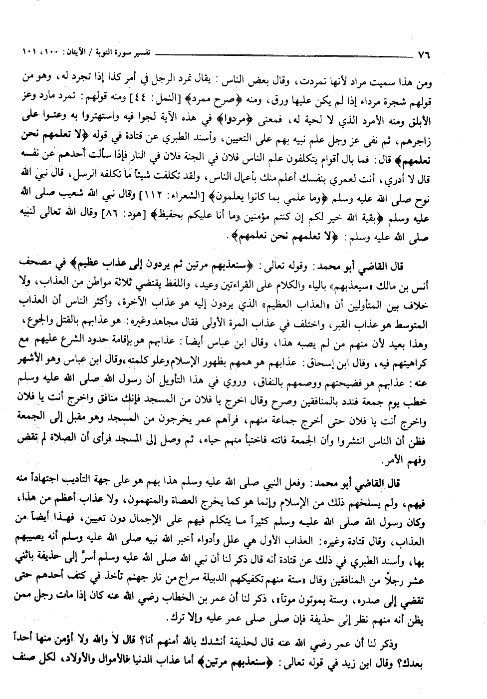 وذكر لنا أن عمر رضي الله عنه قال لحذيفة أنشدك بالله أمنهم أنا؟ قال لا والله ولا أؤمن منها أحدا بعدك؟ وقال ابن زيد في قوله تعالى: سَنُعَذِّبُهُمْ مَرَّتَيْنِ أما عذاب الدنيا فالأموال والأولاد، لكل صنف