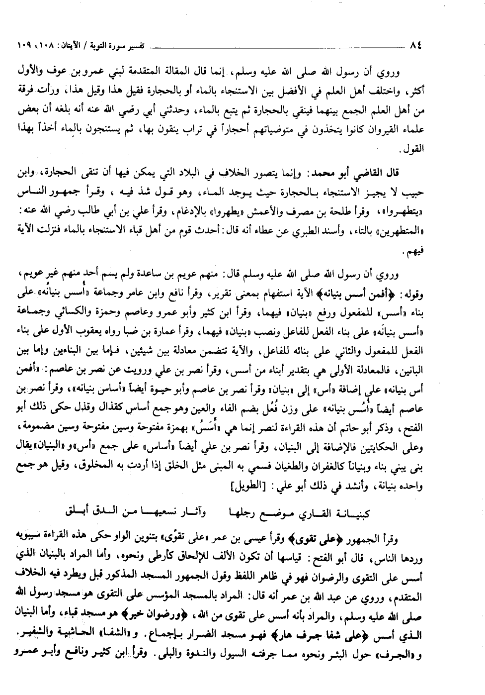وروي أن رسول الله صلى الله عليه وسلم قال: منهم عويم بن ساعدة ولم يسم أحد منهم غير عويم، وقوله: أَفَمَنْ أَسَّسَ بُنْيانَهُ الآية استفهام بمعنى تقرير، وقرأ نافع وابن عامر وجماعة «أسس بنيانه» على بناء «أسس» للمفعول ورفع «بنيان» فيهما، وقرأ ابن كثير وأبو عمرو وعاصم وحمزة والكسائي وجماعة «أسس بنيانه» على بناء الفعل للفاعل ونصب «بنيان» فيهما، وقرأ عمارة بن ضبا رواه يعقوب الأول على بناء الفعل للمفعول والثاني على بنائه للفاعل، والآية تتضمن معادلة بين شيئين، فإما بين البناءين وإما بين البانين، فالمعادلة الأولى هي بتقدير أبناء من أسس، وقرأ نصر بن علي ورويت عن نصر بن عاصم: «أفمن أس بنيانه» على إضافة «أس» إلى «بنيان» وقرأ نصر بن عاصم وأبو حيوة أيضا «أساس بنيانه» ، وقرأ نصر بن عاصم أيضا «أسس بنيانه» على وزن فعل بضم الفاء والعين وهو جمع أساس كقذال وقذل حكى ذلك أبو الفتح، وذكر أبو حاتم أن هذه القراءة لنصر إنما هي «أسس» بهمزة مفتوحة وسين مفتوحة وسين مضمومة، وعلى الحكايتين فالإضافة إلى البنيان، وقرأ نصر بن علي أيضا «أساس» على جمع «أس» و «البنيان» يقال بنى يبني بناء وبنيانا كالغفران والطغيان فسمي به المبنى مثل الخلق إذا أردت به المخلوق، وقيل هو جمع واحده بنيانة، وأنشد في ذلك أبو علي: [الطويل]
