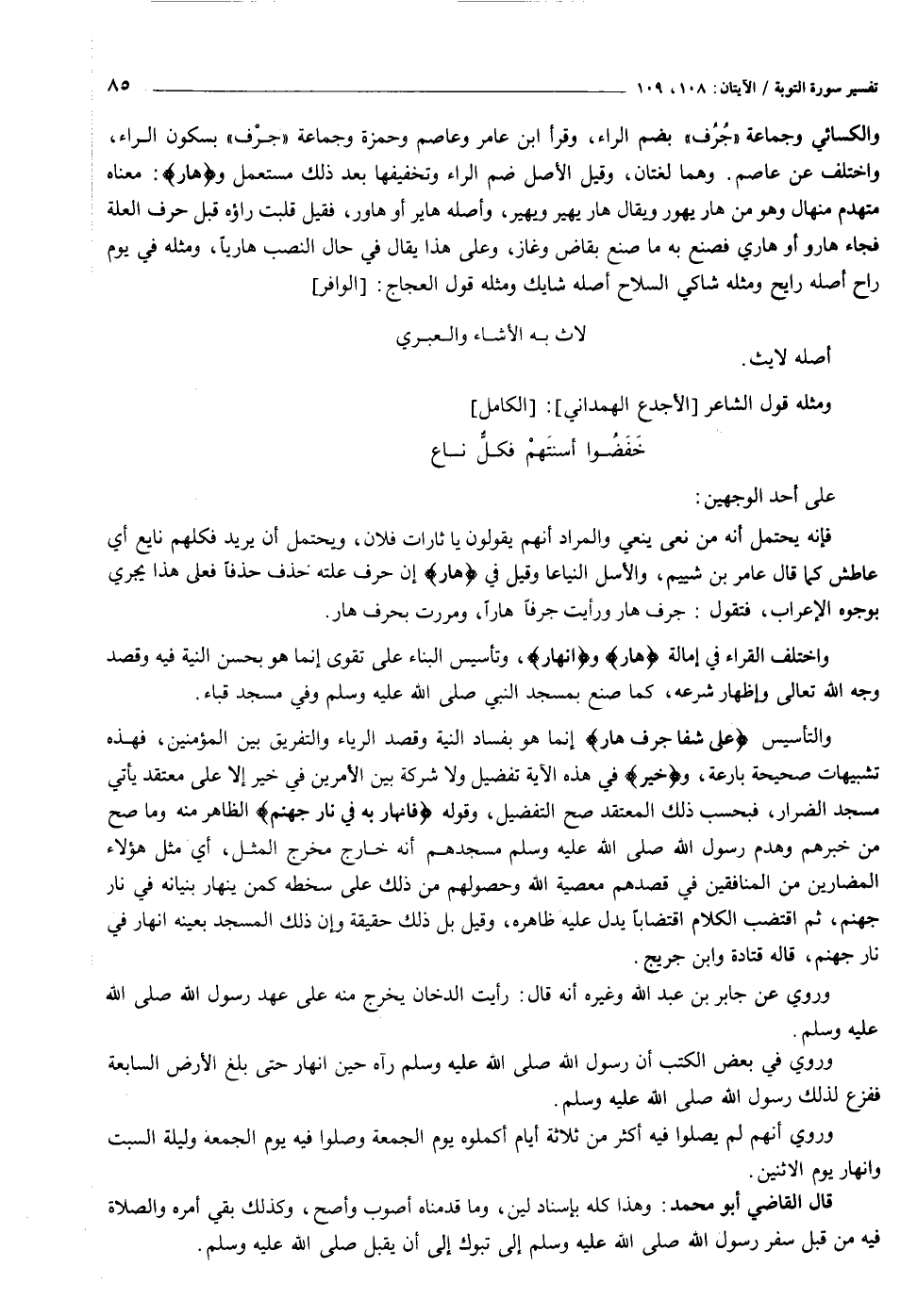 والكسائي وجماعة «جرف» بضم الراء، وقرأ ابن عامر وعاصم وحمزة وجماعة «جرف» بسكون الراء، واختلف عن عاصم. وهما لغتان، وقيل الأصل ضم الراء وتخفيفها بعد ذلك مستعمل وهارٍ: معناه متهدم منهال وهو من هار يهور ويقال هار يهير ويهير، وأصله هاير أو هاور، فقيل قلبت راؤه قبل حرف العلة فجاء هارو أو هاري فصنع به ما صنع بقاض وغاز، وعلى هذا يقال في حال النصب هاريا، ومثله في يوم راح أصله رايح ومثله شاكي السلاح أصله شايك ومثله قول العجاج: [الوافر] لاث به الأشاء والعبري أصله لايث.