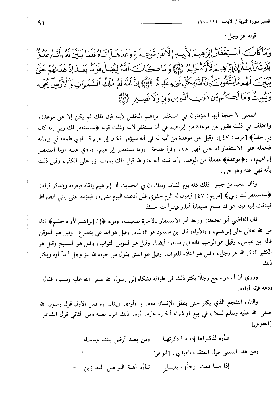 وَما كانَ اسْتِغْفارُ إِبْراهِيمَ لِأَبِيهِ إِلاَّ عَنْ مَوْعِدَةٍ وَعَدَها إِيَّاهُ فَلَمَّا تَبَيَّنَ لَهُ أَنَّهُ عَدُوٌّ لِلَّهِ تَبَرَّأَ مِنْهُ إِنَّ إِبْراهِيمَ لَأَوَّاهٌ حَلِيمٌ (١١٤) وَما كانَ اللَّهُ لِيُضِلَّ قَوْماً بَعْدَ إِذْ هَداهُمْ حَتَّى يُبَيِّنَ لَهُمْ ما يَتَّقُونَ إِنَّ اللَّهَ بِكُلِّ شَيْءٍ عَلِيمٌ (١١٥) إِنَّ اللَّهَ لَهُ مُلْكُ السَّماواتِ وَالْأَرْضِ يُحْيِي وَيُمِيتُ وَما لَكُمْ مِنْ دُونِ اللَّهِ مِنْ وَلِيٍّ وَلا نَصِيرٍ (١١٦)
