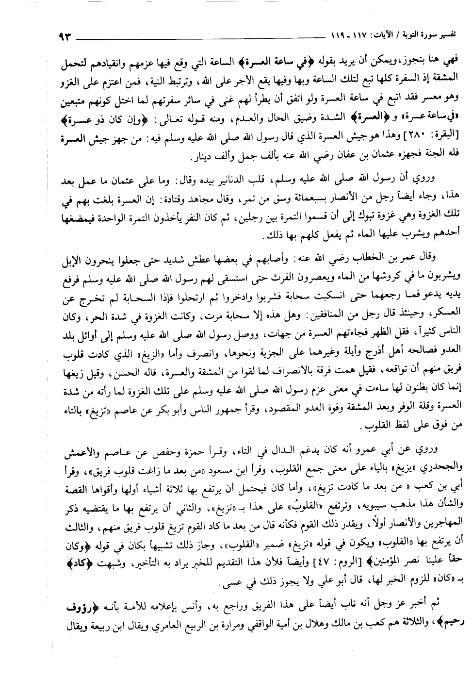 فهي هنا بتجوز، ويمكن أن يريد بقوله فِي ساعَةِ الْعُسْرَةِ الساعة التي وقع فيها عزمهم وانقيادهم لتحمل المشقة إذ السفرة كلها تبع لتلك الساعة وبها وفيها يقع الأجر على الله، وترتبط النية، فمن اعتزم على الغزو وهو معسر فقد اتبع في ساعة العسرة ولو اتفق أن يطرأ لهم غنى في سائر سفرتهم لما اختل كونهم متبعين «في ساعة عسرة» والْعُسْرَةِ الشدة وضيق الحال والعدم، ومنه قوله تعالى: وَإِنْ كانَ ذُو عُسْرَةٍ [البقرة: ٢٨٠] وهذا هو جيش العسرة الذي قال رسول الله صلى الله عليه وسلم فيه: من جهز جيش العسرة فله الجنة فجهزه عثمان بن عفان رضي الله عنه بألف جمل وألف دينار.