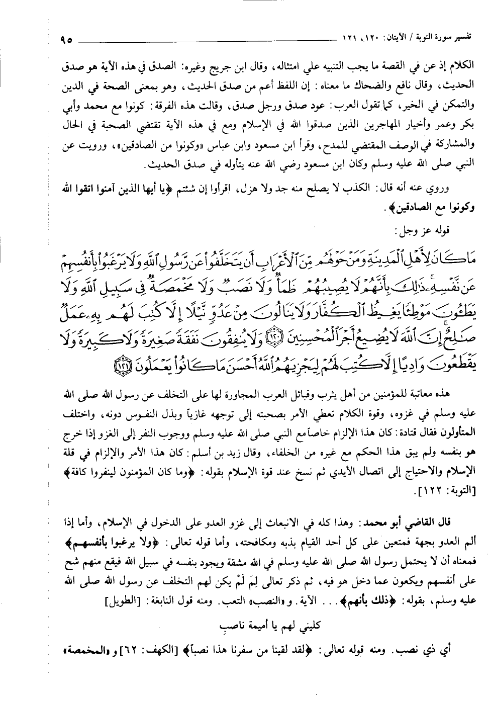 ما كانَ لِأَهْلِ الْمَدِينَةِ وَمَنْ حَوْلَهُمْ مِنَ الْأَعْرابِ أَنْ يَتَخَلَّفُوا عَنْ رَسُولِ اللَّهِ وَلا يَرْغَبُوا بِأَنْفُسِهِمْ عَنْ نَفْسِهِ ذلِكَ بِأَنَّهُمْ لا يُصِيبُهُمْ ظَمَأٌ وَلا نَصَبٌ وَلا مَخْمَصَةٌ فِي سَبِيلِ اللَّهِ وَلا يَطَؤُنَ مَوْطِئاً يَغِيظُ الْكُفَّارَ وَلا يَنالُونَ مِنْ عَدُوٍّ نَيْلاً إِلاَّ كُتِبَ لَهُمْ بِهِ عَمَلٌ صالِحٌ إِنَّ اللَّهَ لا يُضِيعُ أَجْرَ الْمُحْسِنِينَ (١٢٠) وَلا يُنْفِقُونَ نَفَقَةً صَغِيرَةً وَلا كَبِيرَةً وَلا يَقْطَعُونَ وادِياً إِلاَّ كُتِبَ لَهُمْ لِيَجْزِيَهُمُ اللَّهُ أَحْسَنَ ما كانُوا يَعْمَلُونَ (١٢١)