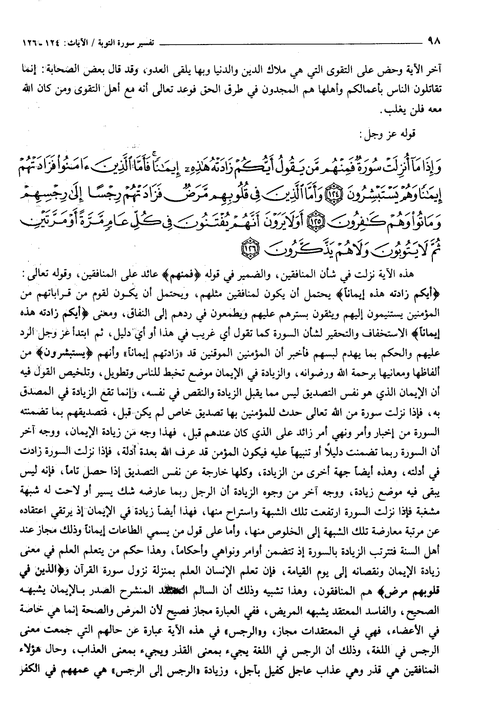 أَيُّكُمْ زادَتْهُ هذِهِ إِيماناً يحتمل أن يكون لمنافقين مثلهم، ويحتمل أن يكون لقوم من قراباتهم من المؤمنين يستنيمون إليهم ويثقون بسترهم عليهم ويطمعون في ردهم إلى النفاق، ومعنى أَيُّكُمْ زادَتْهُ هذِهِ إِيماناً الاستخفاف والتحقير لشأن السورة كما تقول أي غريب في هذا أو أي دليل، ثم ابتدأ عز وجل الرد عليهم والحكم بما يهدم لبسهم فأخبر أن المؤمنين الموقنين قد «زادتهم إيمانا» وأنهم يَسْتَبْشِرُونَ من ألفاظها ومعانيها برحمة الله ورضوانه، والزيادة في الإيمان موضع تخبط للناس وتطويل، وتلخيص القول فيه أن الإيمان الذي هو نفس التصديق ليس مما يقبل الزيادة والنقص في نفسه، وإنما تقع الزيادة في المصدق به، فإذا نزلت سورة من الله تعالى، حدث للمؤمنين بها تصديق خاص لم يكن قبل، فتصديقهم بما تضمنته السورة من إخبار وأمر ونهي أمر زائد على الذي كان عندهم قبل، فهذا وجه من زيادة الإيمان، ووجه آخر أن السورة ربما تضمنت دليلا أو تنبيها عليه فيكون المؤمن قد عرف الله بعدة أدلة، فإذا نزلت السورة زادت في أدلته، وهذه أيضا جهة أخرى من الزيادة، وكلها خارجة عن نفس التصديق إذا حصل تاما، فإنه ليس يبقى فيه موضع زيادة، ووجه آخر من وجوه الزيادة أن الرجل ربما عارضه شك يسير أو لاحت له شبهة مشغبة فإذا نزلت السورة ارتفعت تلك الشبهة واستراح منها، فهذا أيضا زيادة في الإيمان إذ يرتقي اعتقاده عن مرتبة معارضة تلك الشبهة إلى الخلوص منها، وأما على قول من يسمي الطاعات إيمانا وذلك مجاز عند أهل السنة فتترتب الزيادة بالسورة إذ تتضمن أوامر ونواهي وأحكاما، وهذا حكم من يتعلم العلم في معنى زيادة الإيمان ونقصانه إلى يوم القيامة، فإن تعلم الإنسان العلم بمنزلة نزول سورة القرآن والَّذِينَ فِي قُلُوبِهِمْ مَرَضٌ هم المنافقون، وهذا تشبيه وذلك أن السالم المعتقد المنشرح الصدر بالإيمان يشبهه الصحيح، والفاسد المعتقد يشبهه المريض، ففي العبارة مجاز فصيح لأن المرض والصحة إنما هي خاصة في الأعضاء، فهي في المعتقدات مجاز، و «الرجس» في هذه الآية عبارة عن حالهم التي جمعت معنى الرجس في اللغة، وذلك أن الرجس في اللغة يجيء بمعنى القذر ويجيء بمعنى العذاب، وحال هؤلاء المنافقين هي قذر وهي عذاب عاجل كفيل بآجل، وزيادة «الرجس إلى الرجس» هي عمههم في الكفر