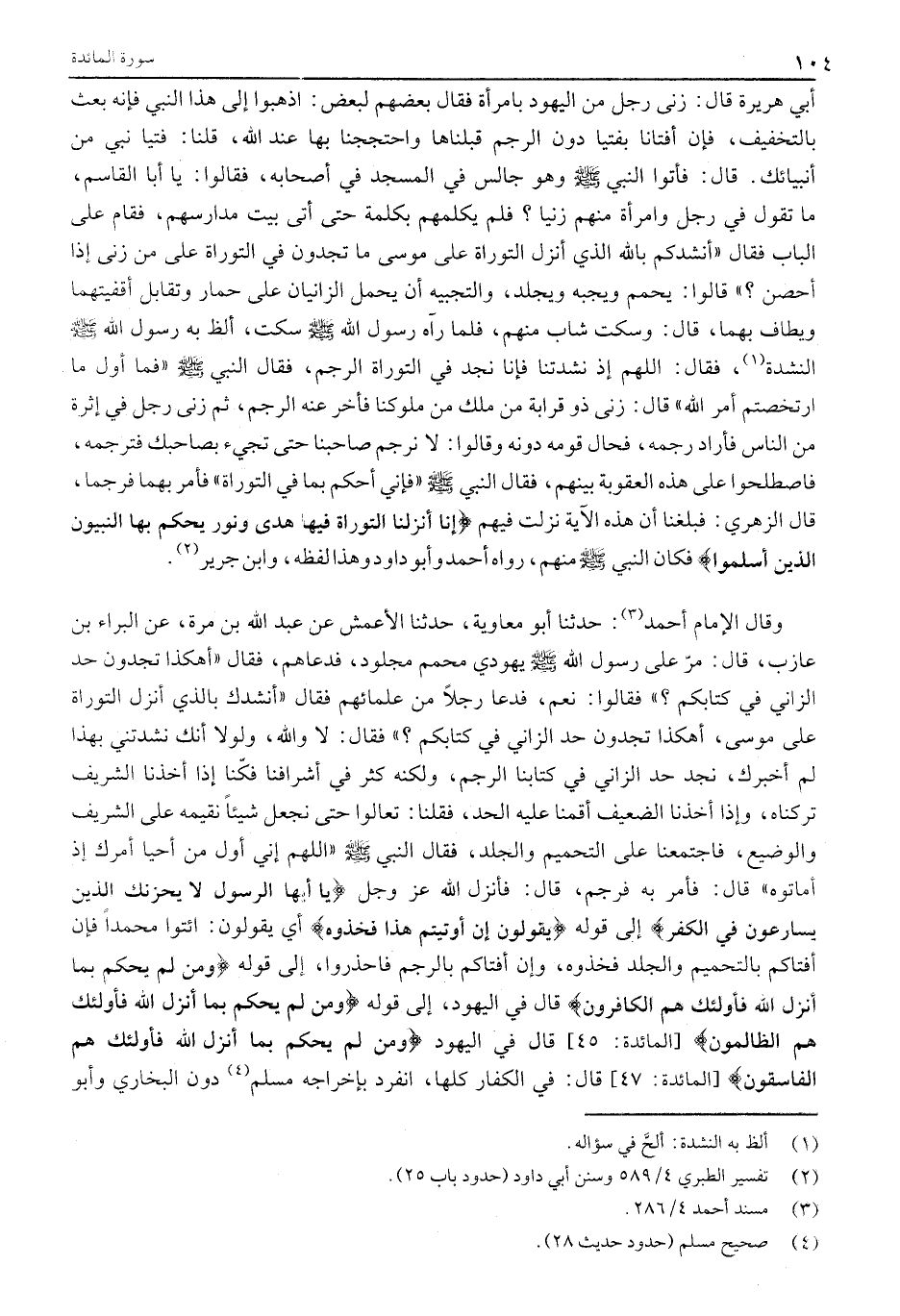 أَبِي هُرَيْرَةَ قَالَ: زَنَى رَجُلٌ مِنَ الْيَهُودِ بِامْرَأَةٍ فَقَالَ بَعْضُهُمْ لِبَعْضٍ: اذْهَبُوا إِلَى هَذَا النَّبِيِّ فَإِنَّهُ بُعِثَ بِالتَّخْفِيفِ، فَإِنْ أَفْتَانَا بِفُتْيَا دُونَ الرَّجْمِ قَبِلْنَاهَا وَاحْتَجَجْنَا بِهَا عِنْدَ اللَّهِ، قُلْنَا: فُتْيَا نَبِيٍّ مِنْ أَنْبِيَائِكَ. قَالَ: فَأَتَوُا النَّبِيَّ صَلَّى اللَّهُ عَلَيْهِ وَسَلَّمَ وَهُوَ جَالِسٌ فِي الْمَسْجِدِ فِي أَصْحَابِهِ، فَقَالُوا: يَا أَبَا الْقَاسِمِ، مَا تَقُولُ فِي رَجُلٍ وَامْرَأَةٍ مِنْهُمْ زنيا؟ فلم يكلمهم بكلمة حَتَّى أَتَى بَيْتَ مُدَارِسِهِمْ، فَقَامَ عَلَى الْبَابِ فَقَالَ «أَنْشُدُكُمْ بِاللَّهِ الذِي أَنْزَلَ التَّوْرَاةَ عَلَى مُوسَى مَا تَجِدُونَ فِي التَّوْرَاةِ عَلَى مَنْ زَنَى إِذَا أُحْصِنَ؟» قَالُوا: يُحَمَّمُ وَيُجَبَّهُ وَيُجْلَدُ، وَالتَّجْبِيَةُ أَنْ يُحْمَلَ الزَّانِيَانِ عَلَى حِمَارٍ وَتُقَابِلَ أَقْفِيَتُهُمَا وَيُطَافُ بِهِمَا، قَالَ: وَسَكَتَ شَابٌّ مِنْهُمْ، فَلَمَّا رَآهُ رَسُولُ اللَّهِ صَلَّى اللَّهُ عَلَيْهِ وَسَلَّمَ سَكَتَ، أَلَظَّ بِهِ رَسُولُ اللَّهِ صَلَّى اللَّهُ عَلَيْهِ وَسَلَّمَ النَّشْدَةَ «1» ، فَقَالَ: اللَّهُمَّ إِذْ نَشَدْتَنَا فَإِنَّا نَجِدُ فِي التَّوْرَاةِ الرَّجْمَ، فَقَالَ النَّبِيُّ صَلَّى اللَّهُ عَلَيْهِ وَسَلَّمَ «فَمَا أَوَّلَ مَا ارْتَخَصْتُمْ أَمْرَ اللَّهِ» قَالَ: زَنَى ذُو قَرَابَةٍ مِنْ مَلِكٍ مِنْ مُلُوكِنَا فَأُخِّرَ عَنْهُ الرَّجْمَ، ثُمَّ زَنَى رَجُلٌ فِي أَثَرِهِ مِنَ النَّاسِ فَأَرَادَ رَجْمَهُ، فَحَالَ قَوْمُهُ دُونَهُ وَقَالُوا: لا نرجم صاحبنا حتى تجيء بصاحبك فترجمه، فاصطلحوا على هَذِهِ الْعُقُوبَةَ بَيْنَهُمْ، فَقَالَ النَّبِيُّ صَلَّى اللَّهُ عَلَيْهِ وَسَلَّمَ «فَإِنِّي أَحْكُمُ بِمَا فِي التَّوْرَاةِ» فَأَمَرَ بِهِمَا فَرُجِمَا، قَالَ الزُّهْرِيُّ: فَبَلَغَنَا أَنَّ هَذِهِ الْآيَةَ نَزَلَتْ فِيهِمْ إِنَّا أَنْزَلْنَا التَّوْراةَ فِيها هُدىً وَنُورٌ يَحْكُمُ بِهَا النَّبِيُّونَ الَّذِينَ أَسْلَمُوا فَكَانَ النَّبِيُّ صَلَّى اللَّهُ عَلَيْهِ وَسَلَّمَ مِنْهُمْ، رَوَاهُ أَحْمَدُ وَأَبُو دَاوُدَ وَهَذَا لَفْظُهُ، وَابْنُ جَرِيرٍ «2» .