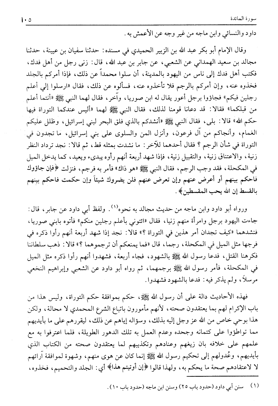 وَقَالَ الْإِمَامُ أَبُو بَكْرٍ عَبْدُ اللَّهِ بْنُ الزُّبَيْرِ الْحُمَيْدِيُّ فِي مُسْنَدِهِ: حَدَّثَنَا سُفْيَانُ بْنُ عُيَيْنَةَ، حَدَّثَنَا مُجَالِدِ بْنِ سَعِيدٍ الْهَمْدَانِيِّ عَنِ الشَّعْبِيِّ، عَنْ جَابِرِ بْنِ عَبْدِ اللَّهِ، قَالَ: زَنَى رَجُلٌ مِنْ أَهْلِ فَدَكَ، فَكَتَبَ أَهْلُ فَدَكَ إِلَى نَاسٍ مِنَ الْيَهُودِ بِالْمَدِينَةِ، أَنْ سَلُوا مُحَمَّدًا عن ذلك، فإذا أَمَرَكُمْ بِالْجِلْدِ فَخُذُوهُ عَنْهُ، وَإِنْ أَمَرَكُمْ بِالرَّجْمِ فلا تأخذوه عنه، فسألوه عن ذلك، فقال «أرسلوا إلي أعلم رجلين فيكم» فجاؤوا بِرَجُلٍ أَعْوَرَ يُقَالُ لَهُ ابْنُ صُورِيَا، وَآخَرَ، فَقَالَ لَهُمَا النَّبِيُّ صَلَّى اللَّهُ عَلَيْهِ وَسَلَّمَ «أَنْتُمَا أَعْلَمُ مَنْ قَبَلَكُمَا» فَقَالَا: قَدْ دَعَانَا قَوْمُنَا لِذَلِكَ، فَقَالَ النَّبِيُّ صَلَّى اللَّهُ عَلَيْهِ وَسَلَّمَ لَهُمَا «أَلَيْسَ عِنْدَكُمَا التَّوْرَاةُ فِيهَا حُكْمُ اللَّهِ» قَالَا: بَلَى، فَقَالَ النَّبِيُّ صَلَّى اللَّهُ عليه وسلم «أنشدكم بِالَّذِي فَلَقَ الْبَحْرَ لِبَنِي إِسْرَائِيلَ، وَظَلَّلَ عَلَيْكُمُ الْغَمَامَ، وَأَنْجَاكُمْ مِنْ آلِ فِرْعَوْنَ، وَأَنْزَلَ الْمَنَّ وَالسَّلْوَى عَلَى بَنِي إِسْرَائِيلَ، مَا تَجِدُونَ فِي التَّوْرَاةِ فِي شَأْنِ الرَّجْمِ؟ فَقَالَ أَحَدُهُمَا لِلْآخَرِ: ما نشدت بمثله قط، ثم قَالَا: نَجْدُ تَرْدَادَ النَّظَرِ زَنْيَةً، وَالِاعْتِنَاقَ زَنْيَةً، والتقبيل زَنْيَةً، فَإِذَا شَهِدَ أَرْبَعَةٌ أَنَّهُمْ رَأَوْهُ يُبْدِئُ وَيُعِيدُ، كَمَا يَدْخُلُ الْمَيْلَ فِي الْمُكْحُلَةِ، فَقَدْ وَجَبَ الرَّجْمُ، فَقَالَ النَّبِيُّ صَلَّى اللَّهُ عَلَيْهِ وَسَلَّمَ «هُوَ ذَاكَ» فَأَمَرَ بِهِ فَرُجِمَ، فَنَزَلَتْ فَإِنْ جاؤُكَ فَاحْكُمْ بَيْنَهُمْ أَوْ أَعْرِضْ عَنْهُمْ وَإِنْ تُعْرِضْ عَنْهُمْ فَلَنْ يَضُرُّوكَ شَيْئاً وَإِنْ حَكَمْتَ فَاحْكُمْ بَيْنَهُمْ بِالْقِسْطِ إِنَّ اللَّهَ يُحِبُّ الْمُقْسِطِينَ.