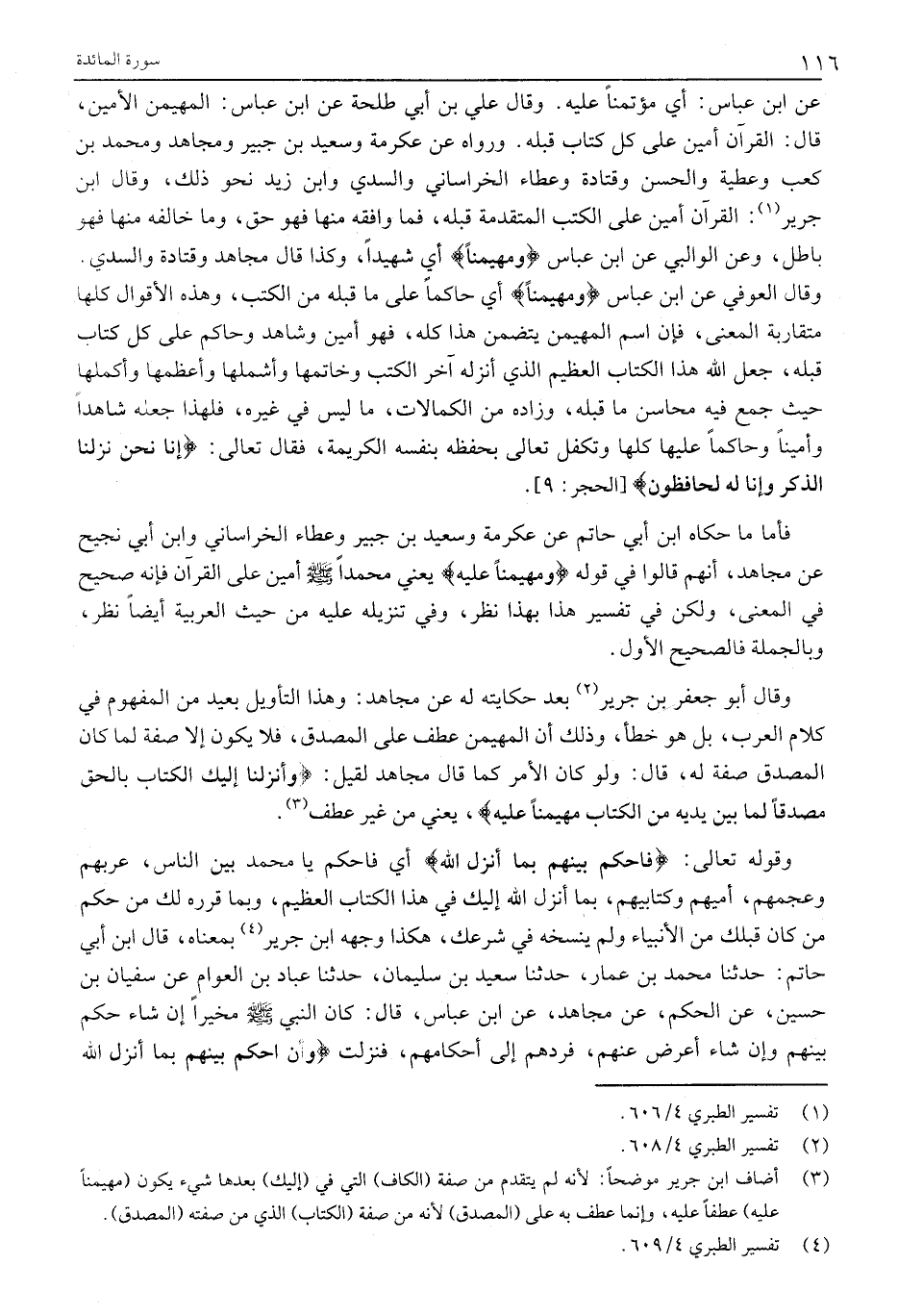 (3) أضاف ابن جرير موضحا: لأنه لم يتقدم من صفة (الكاف) التي في (إليك) بعدها شيء يكون (مهيمنا عليه) عطفا عليه، وإنما عطف به على (المصدق) لأنه من صفة (الكتاب) الذي من صفته (المصدق) .